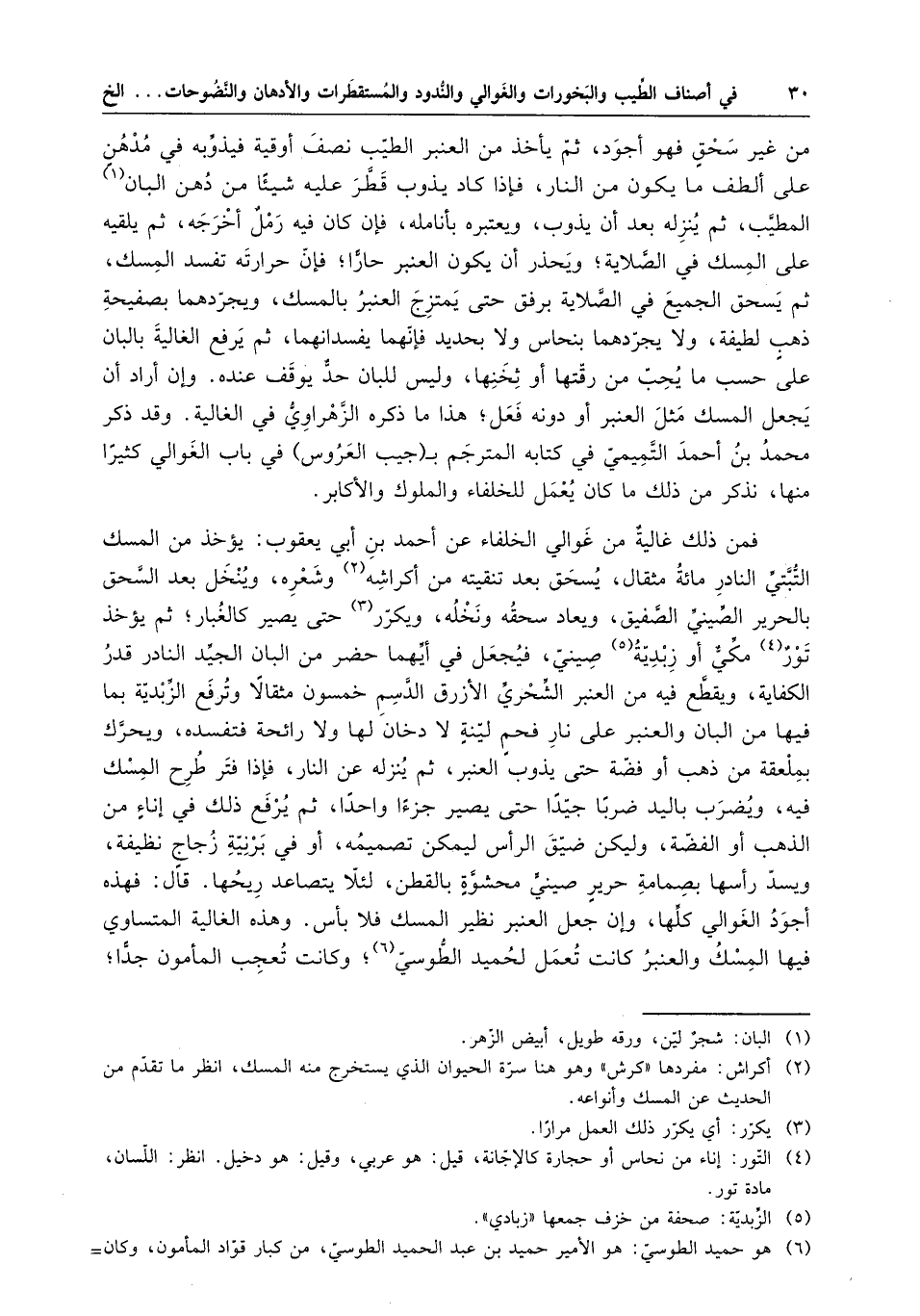 من غير سحق فهو أجود ، ثم يأخذ من العنبر الطيب نصف أوقية فيذوبه في مدهن على ألطف ما يكون من النار ، فاذا كاد يذوب قطر عليه شيئاً من دهن البان المطيب ، ثم ينزله بعد أن يذوب ، ويعتبره بأنامله ، فأن كان فيه رمل أخرجه ، ثم يلقيه على المسك في الصلابة ؛ ويحذر أن يكون العنبر حاراً فإن حرارته تفسد المسك ؛ ثم يسحق الجميع في الصلاية برفق حتى يمتزج العنبربالمسك ، ويجردهما بصفيحة ذهب لطيفة ، ولا يجردهما بنحاس ولا بحديد فإنهما يفسدانهما ، ثم يرفع الغالية بالبان على حسب ما يحب من رقتها أو ثخنها ؛ وليس للبان حد يوقف عنده . وإن أراد أن يجعل المسك مثل العنبر أو دونه فعل . هذا ما ذكره الزهراوي في الغالية . وقد ذكر محمد بن أحمد التميمي في كتابه المترجم " بجيب العروس " في باب الغوالي كثيراً منها ، نذكر من ذلك ما كان يعمل للخلفاء والملوك والأكابر . فمن ذلك غالية من غوالي الخلفاء عن أحمد بن أبي يعقوب : يؤخذ من المسك التبتي النادر مائة مثقال ، يسحق بعد تنقيته من أكراشه وشعره ، وينخل بعد السحق بالحرير الصيني الصفيق ، ويعاد سحقه ونخله ، ويكرر حنى يصير كالغبار ؛ ثم يؤخذ تور مكي أو زبدية صيني ، فيجعل في أيهما حضر من البان الجيد النادر قدر الكفاية ، ويقطع فيه من العنبر الشحري الأزرق الدسم خمسون مثقالاً وترفع الزبدية بما فيها من البان والعنبر على نار فحم لينة لا دخان لها ولا رائحة فتفسده ، ويحرك بملعقة من ذهب أو فضة حتى يذوب العنبر ، ثم ينزله عن النار ، فإذا فتر طرح المسك فيه ، ويضرب باليد ضرباً جيداً حتى يصير جزأ واحدا ، ثم يرفع ذلك في إناء من الذهب أوالفضة ، وليكن ضيق الرأس ليمكن تصميمه ، أو في برنية زجاج نظيفة ، ويسد رأسها بصمامة حرير صيني محشوة بالقطن ، لئلا يتصاعد ريحها . قال : فهذه أجود الغوالي كلها ، وإن جعل العنبر نظير المسك فلا بأس . وهذه الغالية المتساوي فيها المسك والعنبر كانت تعمل لحميد الطوسي ؛ وكانت تعجب المأمون جداً