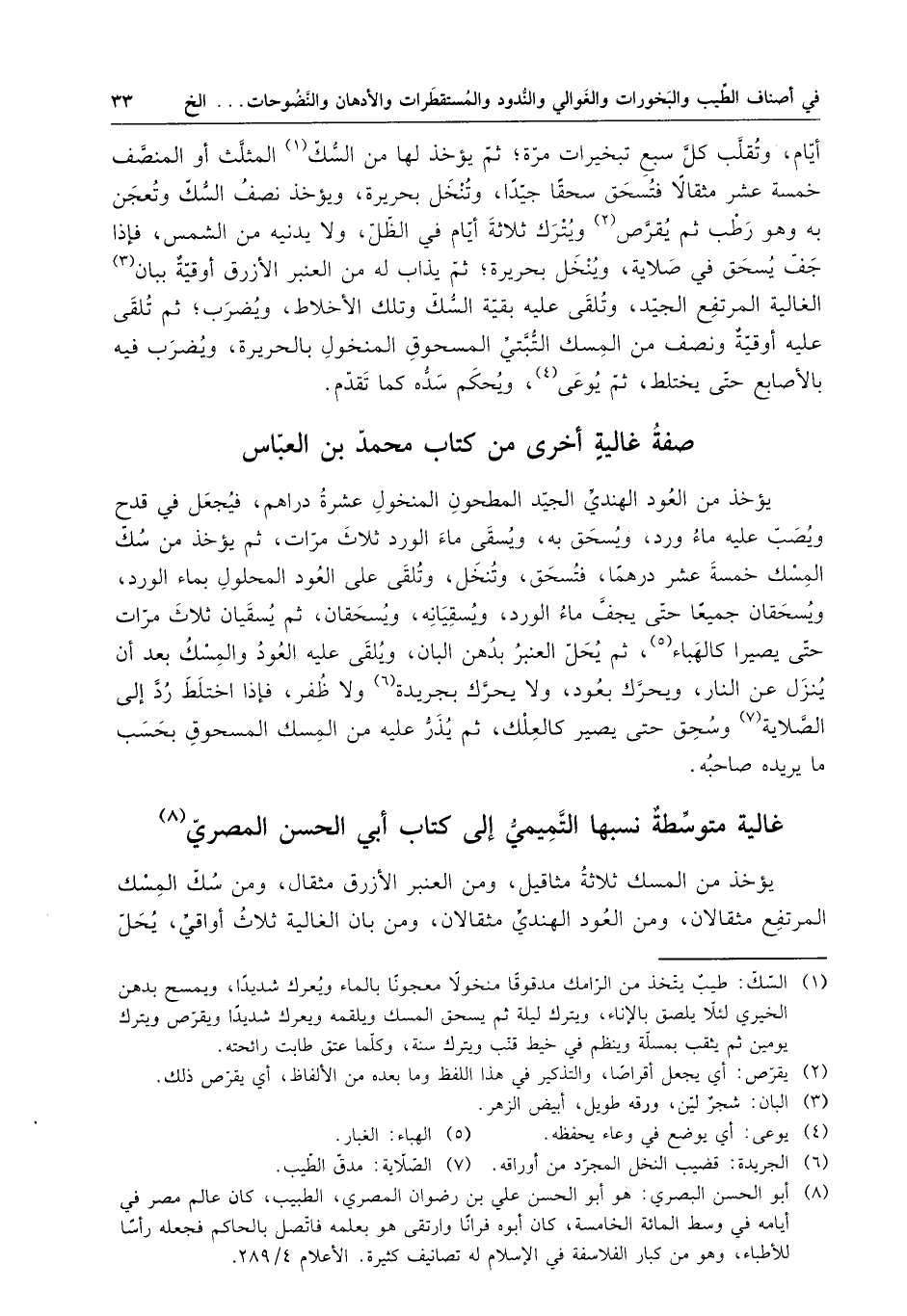 أيام وتقلب كل سبع تبخيرات مرة ؛ ثم يؤخذ لهامن السك المثلث أو المنصف خمسة عشر مثقالا فتسحق سحقاًجيداً ، وتنخل بحريرة ، ويؤخذ نصف السك وتعجن به وهو رطب ثم يقرص ويترك ثلاثة أيام في الظل ، ولا يدنيه من الشمس ، فإذا جف يسحق في صلاية ، وينخل بحريرة ؛ ثم يذاب له من العنبر الأزوق أوقية ببان الغالية المرتفع الجيد ، وتلقى عليه بقية السك وتلك الأخلاط ، ويضرب ؛ ثم تلقى عليه أوقية ونصف من المسك التبتي المسحوق المنخول بالحريرة ، ويضرب فيه بالأصابع حتى يختلط ، ثم يوعى ، ويحكم سده كما تقدم .