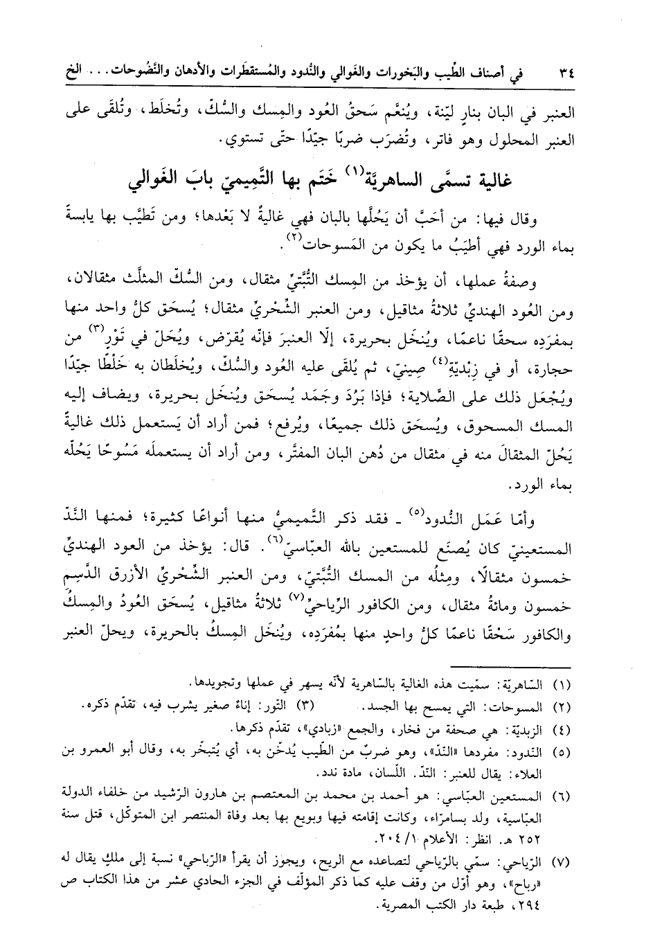 وأما عمل الندود - فقد ذكر التميمي منها أنواعاً كثيرة ؛ فمنها الند المستعيني كان يصنع للمستعين بالله العباسي . قال : يؤخذ من العود الهندي خمسون مثقالا ومثله من المسك التبتي ، ومن العنبر الشحري الأزرق الدسم خمسون ومائة مثقال ومن الكافور الرياحي ثلاثة مثاقيل ؛ يسحق العود والمسك والكافور سحقاً ناعماً كل واحد منها بمفرده ، وينخل المسك بالحريرة ، ويحل العنبر