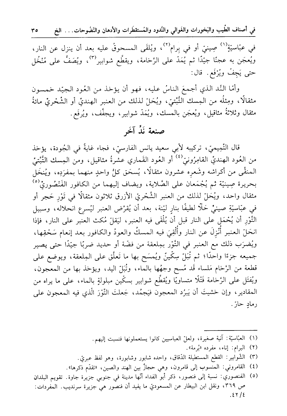 في عباسية صيني أو في برام ، ويلقي المسحوق عليه بعد أن ينزل عن النار ، ويعجن به عجناً جيداً ثم يمد على الرخامة ، ويقطع شوابير ، ويصف على منخل حتى يجف ويرفع ، قال : وأما الند الذي أجمع الناس عليه ، فهو أن يؤخد من العود الجيد خمسون مثقالاً ، ومثله من المسك التبتي ، ويحل لذلك من العنبر الهندن أو الشحري مائة مثقال وثلاثة مثاقيل ، ويعجن بالمسك ، ويمد شوابير ، ويجفف ، ويرفع .