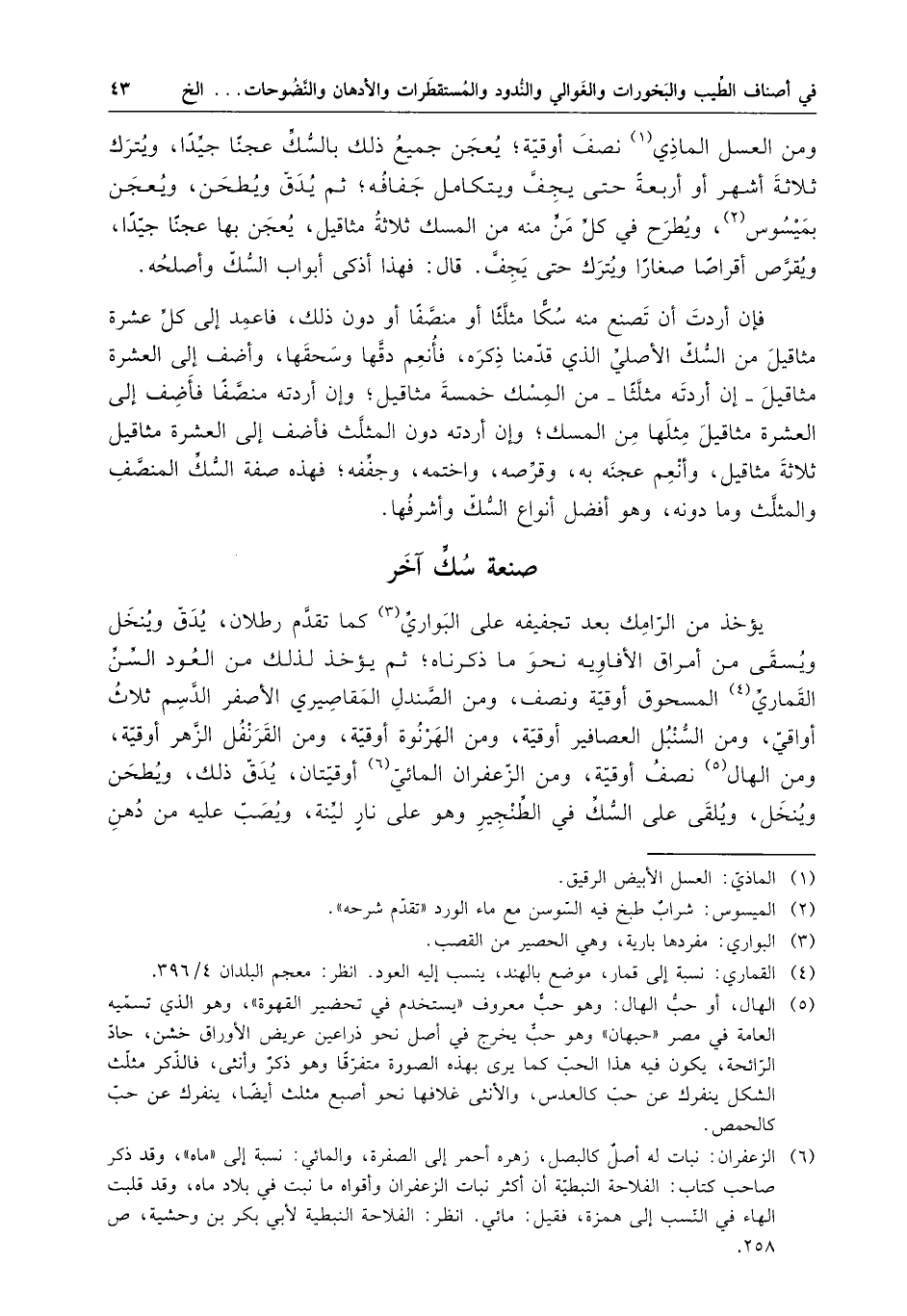 ومن العسل الماذي نصف أوقية ؛ يعجن جميع ذلك بالسك عجناً جيداً ، ويترك ثلاثة أشهر أوأربعة حتى يجف ويتكامل جفافه ؛ ثم يدق ويطحن ، ويعجن بميسوس ، ويطرح في كل من منه من المسك ثلاثة مثاقيل ، يعجن بها عجناً جيداً ، ويقرص أقراصاً صغاراً ويترك حتى يجف . قال : فهذا أذكى أبواب السك وأصلحه .