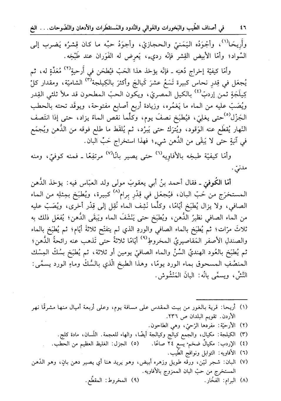 أما الكوفي - فقال أحمد بن أبي يعقوب مولى ولد العباس فيه : يؤخذ الدهن المستخرج من حب البان ، فيجعل في قدر برام كبيرة ، ويطبخ بمثله من الماء الصافي ، ولا يزال يطبخ أياماً ، وكلما نشف الماء نقل إلى قدر أخرى ، ويصب علنه من الماء الصافي نظير الدهن ، ويطبخ حتى ينشف الماء ويبقى الدهن ؛ يفعل ذلك به ثلاث مرات ؛ ثم يطبخ بالماء الصافي والورد الذي لم يتفتح ثلاثة أيام ؛ ثم يطبخ بالماء والصندل الأصفر الماصيري المخروط أياماً ثلاثة حتى تذهب عنه رائحة الدهن ؛ ثم يطبخ بالعود الهندي السن والماء الصافي يومين أو ثلاثة ثم يطبخ المسك المنصف المسحوق بماء الورد يوماً ، وهذا الطبخ الذي بالسك وماء الورد يسمى : النش ، ويسمى بانه : البان المنشوش .