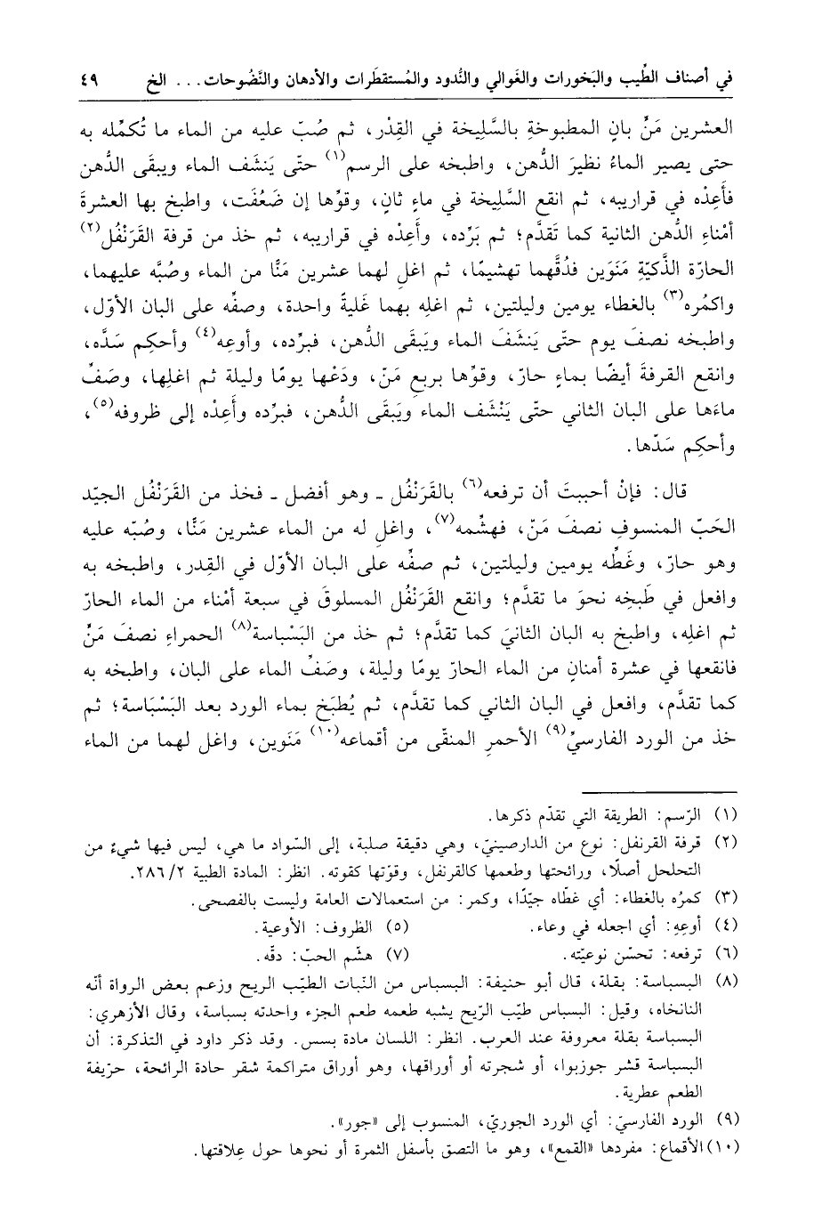 العشرين من بان المطبوخة بالسليخة في القدر ، ثم صل عليه من الماء ما تكمله به حتى يصير الماء نظير الدهن ، واطبخه على الرسم حتى ينشف الماء ويبقى الدهن فأعده في قراريبه ، ثم انقع السليخة أيضاً في ماء ثان ، وقوها إن ضعفت ، واطبخ بها العشرة أمناء الدهن الثانية كما تقدم ؛ ثم برده ، وأعده في قراريبه ؛ ثم خذ من قرنة القرنقل الحارة الذكية منوين قدقهما تهشيما ، ثم اغل لهما عشرين منا من الماء وصبه عليهما ، وأكمره بالغطاء يومين وليلتين ، ثم أغله بهما غلية واحدة ، وصفه على البان الأول ، واطبخه نصف يوم حتى ينشف الماء ويبقى الدهن ، فبرده ، وأوعه وأحكم سده ، وانقع القرفة أيضاً بماء حار ، وقوها بربع من ، ودعها يوما وليلة ثم اغلها ، وصف ماءها على البان الثاني حتى ينشف الماء ويبقى الدهن ، فبرده وأعده إلى ظروفه ، وأحكم سدها .