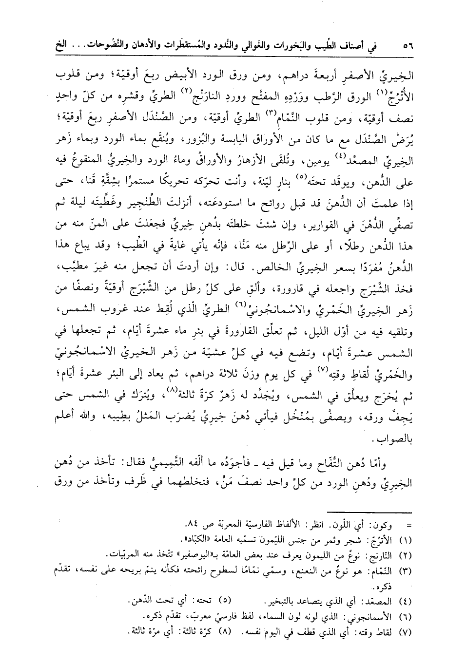 الخيري الخمري والأسمانجوني الطري النقي من خضرته من كل واحد خمسة دراهم ، ومن بزر الخيري الأصفر أربعة دراهم ، ومن ورق الورد الأبيض ربع أوقية ، ومن قلوب الأترج الورق الرطب وورده المفتح وورد النارنج الطري وقشره من كل واحد نصف اوقية ، ومن قلوب النمام الطري أوقية ، ومن الصندل الأصفر ربع أوقية ؛ يرض الصندل مع ما كان من الأوراق اليابسة والبزور ، وينقع بماء الورد وبماء زهر الخيري المصعد يومين ، وتلقى الازهار والاوراق وماء الورد والخيري المنقوع فيه على الدهن ، ويوقد تحته بنار لينة ، وأنت تحركه تحريكاً مستمراً بشقاقنا ، حتى إذا علمت ان الدهن قد قبل روائح ما استودعته ، أنزلت الطنجير وغطيته ليلة ثم تصفي الدهن في القوارير ، وإن شئت خلطته بدهن خيري فجعلت على المن منه من هذا الدهن رطلاً ، أو على الرطل منه منا ، فإنه يأتي غاية في الطيب ؛ وقد يباع هذا الدهن مفردا بسعر الخيري الخالص ، قال : وإن أردت أن تجعل منه غير مطيب ، فخذ الشيرج واجعله في قارورة ، وألق على كل رطل من الشيرج أوقية ونصفا من زهر الخيري الخمري والأسمانجوني الطري الذي لقط عند غروب الشمس ، وتلقيه فيه من أول الليل ، ثم تعلق القارورة في بئر ماء عشرة أيام ، ثم تجعلها في الشمس عشرة أيام ، وتضع فيه في كل عشية من زهر الخيري الاسمانجوني والخمري لقاط وقته في كل يوم وزن ثلاثة دراهم ، ثم يعاد إلى البئر عشرة أيام ؛ ثم يخرج ويعلق في الشمس ، ويجدد له زهر كرة ثالثة ، ويترك في الشمس حتى يجف ورقه ، ويصفى بمنخل فيأتي دهن خيري يضرب المثل بطيبه ؛ والله أعلم بالصواب . وأم دهن التفاح وما قيل فيه - فأجوده ما ألفه التميمي فقال : تأخذ من دهن الخيري ودهن الورد من كل واحد نصف من ، فتخلطهما في ظرف وتأخذ من ورق