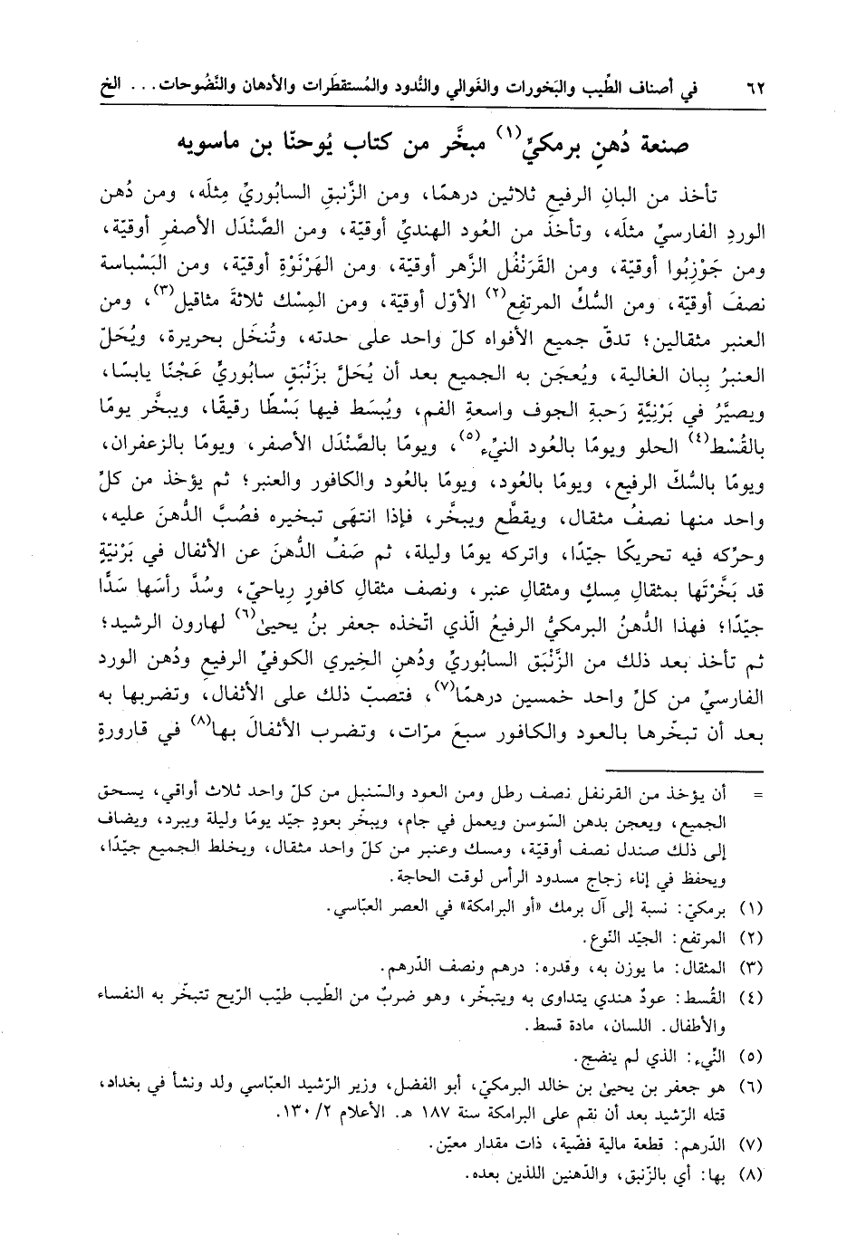 تأخذ من البان الرفيع ثلاثين درهما ، ومن الزنبق السابوري مثله ، ومن دهن الورد الفارسي مثله ، وتأخذ من العود الهندي أوقية ، ومن الصندل الأصفر أوقية ومن جوزبوا أوقية ، ومن القرنفل الزهر أوقية ، ومن الهرنوة أوقية ، ومن البسباسة نصف أوقية ، ومن السك المرتفع الأول أوقية ، ومن المسك ثلاثة مثاقيل ، ومن العنبر مثقالين ؛ تدق جميع الأفواه كل واحد على حدته ، وتنخل بحريرة ، ويحل العنبر ببان الغالية ، ويعجن به الجميع بعد أن يحل بزنبق سابوري عجناً يابساً ، ويصير في برنية رحبة الجوف واسعة الفم ، ويبسط فيها بسطاً رقيقاً ، ويبخر يوماً بالقسط الحلو ويوما بالعود النيء ، ويوما بالصندل الأصفر ، ويوما بالزعفران ، ويوما بالسك الرفيع ، ويوما بالعود ، ويوما بالعود والكافور والعنبر ؛ ثم يؤخذ من كل واحد منها نصف مثقال ، ويقطع ويبخر ؛ فإذا انتهى تبخيره فصب الدهن عليه ، وحركه فيه تحريكاً جيداً ، واتركه يوما وليلة ، ثم صف الدهن عن الأثفال في برنية قد بخرتها بمثقال مسك ومثقال عنبر ، ونصف مثقال كافور رياحي ، وسد رأسها سداً جيداً ؛ فهذا الدهن البرمكي الرفيع الذي اتخذه جعفر بن يحيى لهارون الرشيد ؛ ثم تأخذ بعد ذلك من الزنبق السابوري ودهن الخيري الكوفي الرفيع ودهن الورد الفارسي من كل واحد خمسين درهما ، فتصب ذلك على الأثفال ، وتضربها به بعد أن تبخرها بالعود والكافور سبع مرات ، وتضرب الأثفال بها في قارورة