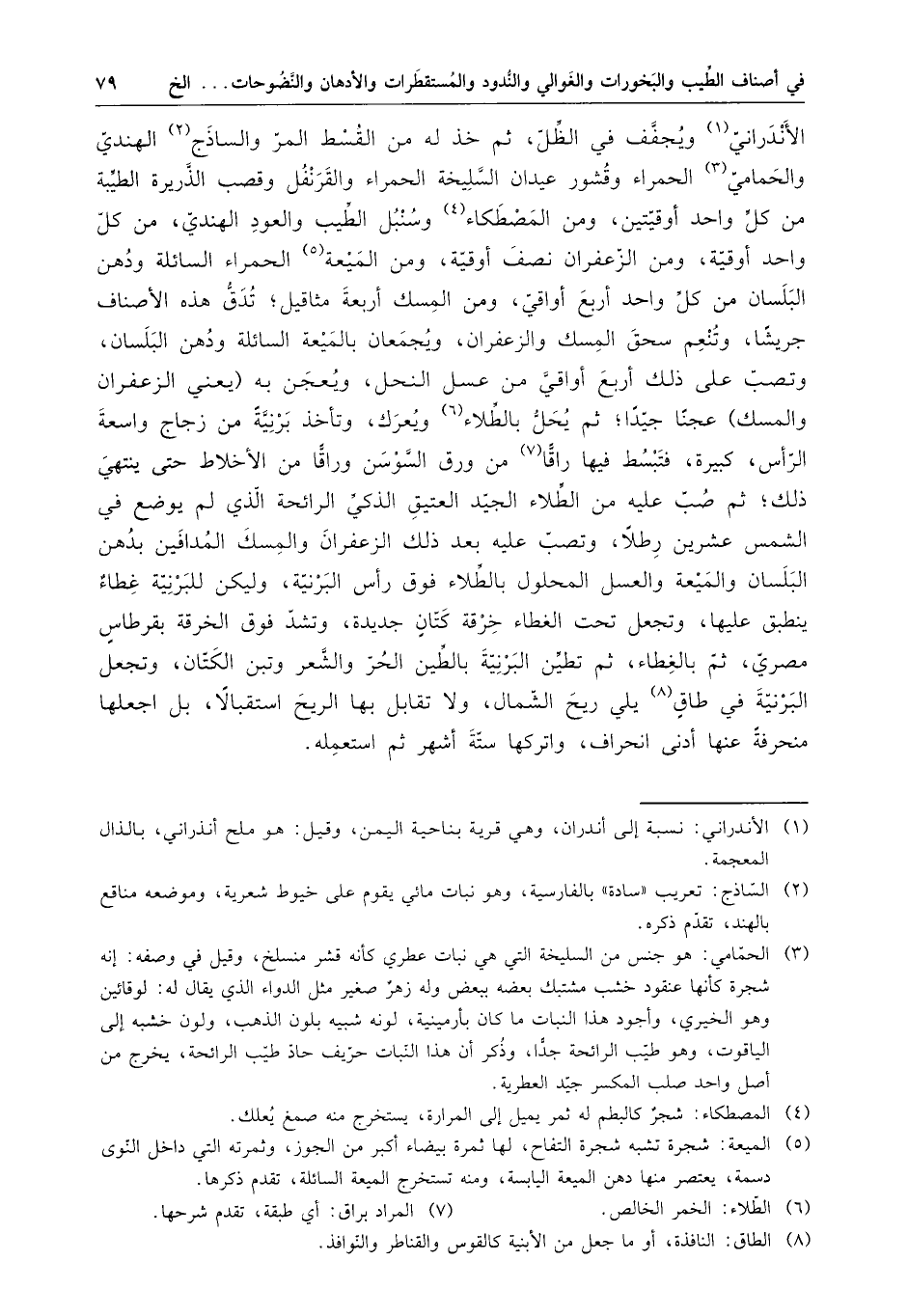الأندراني ويجفف في الظل ؛ ثم خذ له من القسط المر والساذج الهندي والحمامي الحمراء وقشور عيدان السليخة الحمراء والقرنفل وقصب الذريرة الطيبة من كل واحد أوقيتين ومن المصطكاء وسنبل الطيب والعود الهندي ، من كل واحد أربع أواقي ومن المسك أربعة مثاقيل ؛ تدق هذه الأصناف جريشاً ، وتنعم سحق المسك والزعفران ، ويجمعان بالميعة السائلة ودهن البلسان ، وتصب على ذلك أربع أواقي من عسل النحل ، ويعجن به " يعني الزعفران والمسك " عجناً جيداً ؛ ثم يحل بالطلاء ويعرك وتأخذ برنية من زجاج واسعة الرأس ، كبيرة ، فتبسط فيها راقاً من ورق السوسن وراقاً من الأخلاط حتى ينتهي ذلك ؛ ثم صب عليه من الطلاء الجيد العتيق الذكي الرائحة الذي لم يوضع في الشمس عشرين رطلا ، وتصب عليه بعد ذلك الزعفران والمسك المدافين بدهن البلسان والميعة والعسل المحلول بالطلاء فوق رأس البرنية ، وليكن للبرنية غطاء ينطبق عليها ، وتجعل تحت الغطاء خرقة كتان جديدة ، وتشد فوق الخرقة بقرطاس مصري ، ثم بالغطاء ، ثم تطين البرنية بالطين الحر والشعر وتبن الكتان ، وتجعل البرنية في طاق يلي ريح الشمال ، ولا تقابل بها الريح استقبالا ، بل اجعلها منحرفة عنها أدنى انحراف ، واتركها ستة أشهر ثم استعمله .