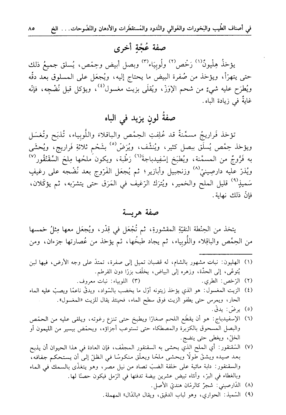 تؤخذ فراريج مسمنة قد علفت الحمص والباقلاء واللوبياء تذبح وتغسل ويؤخذ حمص يسلق ببصل كثير ، وينشف ، ويرض بشحم ثلاثة فراريج ، ويحشى به فروج من المسمنة ، ويطبخ إسفيدباجة رطبة ، ويكون ملحها ملح السقنقور ويدر عليه دار صيني وزنجبيل وابازير ؛ ثم يجعل الفروج بعد نضجه على رغيف سميد قليل الملح والخمير ، ويترك الرغيف في المرق حتى يتشربه ، ثم يؤكلان ، فإن ذلك نهاية .