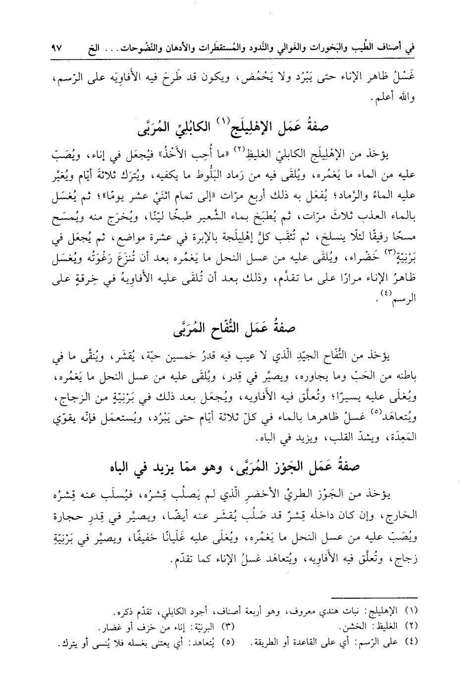 يؤخذ من الإهليلج الكابلي الغليظ " ما أحب الأخذ " فيحعل في إناء ، ويصب عليه من الماء ما يغمره ، ويلقى فيه من رماد البلوط ما يكفيه ، ويترك ثلاثة أيام ويغير عليه الماء والرماد ؛ يفعل به ذلك أربع مرات " إلى تماتم اثني عشر يوما " ؛ ثم يغسل بالماء العذب ثلاث مرات ، ثم يطبخ بماء الشعير طبخاً ليناً ، ويخرج منه ويمسح مسحاً رفيقاً لئلا ينسلخ ، ثم تثقب كل إهليلجة بالإبرة في عِشرة مواضع ثم يجعل في برنية خضراء ، ويلقى عليه من عسل النحل ما يغمره بعد أن تنزع رغوته ويغسل ظاهر الإناء مراراً على ما تقدم ، وذلك بعد أن تلقى عليه الأفاويه في خرقة على الرسم .