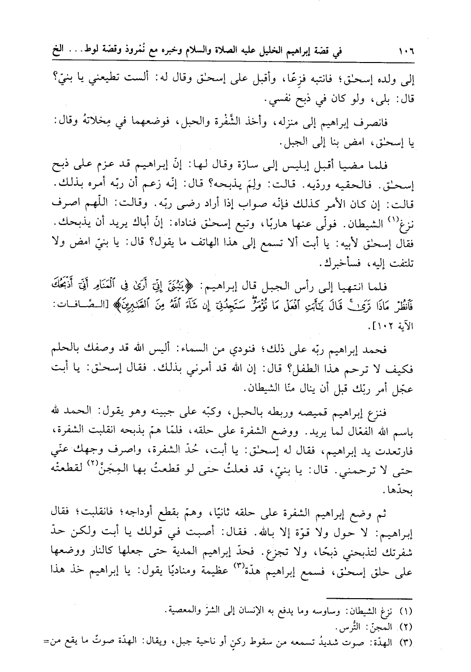 فنزع إبراهيم قميصه وربطه بالحبل ، وكبه على جبينه وهو يقول : الحمد لله باسم الله الفعال لما يريد ، ووضع الشفرة على حلقه ، فلما هم بذبحه انقلبت الشفرة ، فارتعدت يد إبراهيم ، فقال له إسحاق : يا أبت ، حد الشفرة ، واصرف وجهك عني حتى لا ترحمني . قال : أيا بني ، قد فعلت حتى لو قطعت بها المجن لقطعته بحدها .
