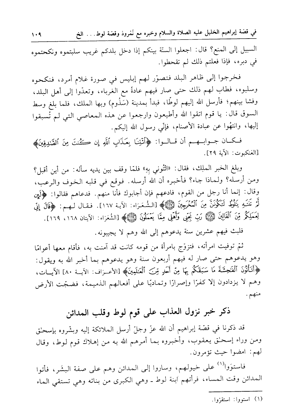 فخرجوا إلى ظاهر البلد فتصور لهم إبليس في صورة غلام أمرد ، فنكحوه وسلبوه ، فطاب لهم ذلك حتى صار فيهم عادة مع الغرباء ، وتعدوا إلى أهل البلد ، وفشا بينهم ؛ فأرسل الله إليهم لوطاً ، فبدأ بمدينة سذوم وبها الملك ، فلما بلغ وسط السوق قال : يا قوم اتقوا الله وأطيعون وارجعوا عن هذه المعاصي التي لم تسبقوا إليها ، وانتهوا عن عبادة الأصنام ، فإني رسول الله إليكم .