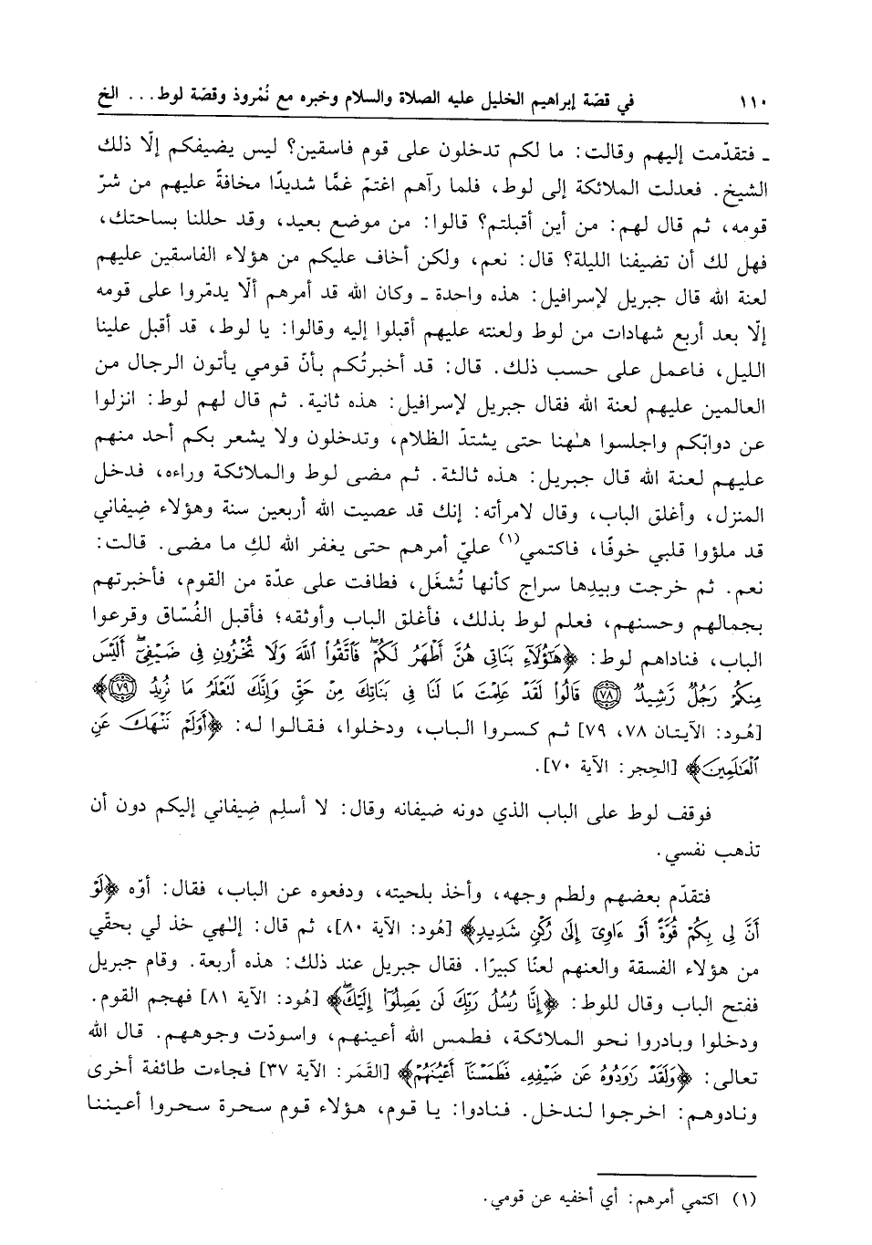 - فتقدمت إليهم وقالت : ما لكم تدخلون على قوم فاسقين ؟ ليس يضيفكم إلا ذلك الشيخ . فعدلت الملائكة إلى لوط ، فلما رآهم اغتم غماً شديداً مخافة عليهم من شر قومه ، ثم قال لهم : من أين أقبلتم ؟ قالوا : من موضع بعيد ، وقد حللنا بساحتك ، فهل لك أن تضيفنا الليلة ؟ قال : نعم ، ولكن أخاف عليكم من هؤلاء الفاسقين - عليهم لعنة الله - قال جبريل لإسرافيل : هذه واحدة - وكان الله قد أمرهم إلا يدمروا على قومه إلا بعد أربع شهادات من لوط ولعنته عليهم - ثم أقبلوا إليه وقالوا : يا لوط ، قد أقبل علينا الليل ، فاعمل على حسب ذلك . قال : قد أخبرتكم بأن قومي يأتون الرجال من العالمين - عليهم لعنة الله - فقال جبريل لإسرافيل : هذه ثانية . ثم قال لهم لوط : انزلوا عن دوابكم واجلسوا هذا هنا حتى يشتد الظلام ، وتدخلوا ولا يشعر بكم أحد منهم - عليهم لعنة الله - قال جبريل : هذه ثالثة ، وقال لامرأته : إنك قد عصيت الله أربعين سنة وهؤلاء ضيوفي قد ملأوا قلبي خوفاً ، فاكتمي علي أمرهم حتى يغفر الله لك ما مضى . قالت : نعم . ثم خرجت وبيدها سراج كأنها تشعل ، فطافت على عدة من القوم ، فأخبرتهم بجمالهم وحسنهم ، فعلم لوط بذلك ، فأغلق الباب وأوثقه ؛ فأقبل الفساق وقرعوا الباب ، فناداهم لوط : " هؤلاء بناتي هن أطهر لكم فاتقوا الله ولا تخزون في ضيفي أليس منكم رجل رشيد ، قالوا لقد علمت ما لنا في بناتك من حق وإنك لتعلم ما نريد " ثم كسروا الباب ، ودخلوا ، فقالوا له : " أولم ننهك عن العالمين " .