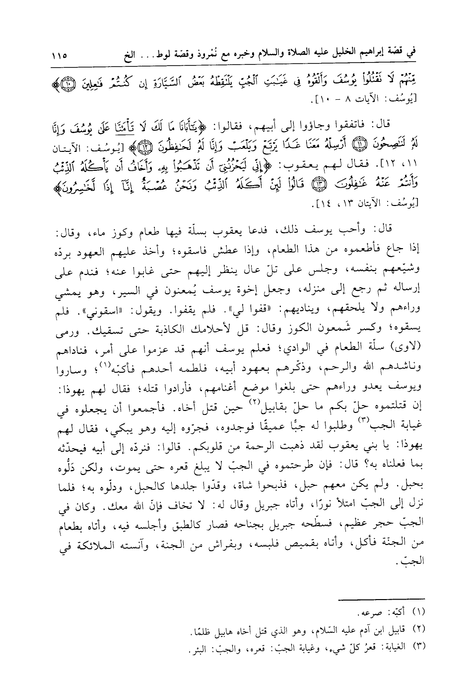 قال : وأحب يوسف ذلك ، فدعا يعقوب بسلة فيها طعام وكوز ماء ، وقال : إذا جاع فأطعموه من هذا الطعام ، وإذا عطش فاسقوه ؛ وأخذ عليهم العهود برده وشيعهم بنفسه ، وجلس على تل عال ينظر إليهم حتى غابوا عنه ؛ فندم على إرساله ثم رجع إلى منزله ، وجعل إخوة يوسف يمعنون في السير ، وهو يمشي وراءهم ولا يلحقهم ، ويناديهم : قفوا لي . فلم يقفوا . ويقول : اسقوني . فلم يسقوه ؛ وكسر شمعون الكوز وقال : قل لأحلامك الكاذبة حتى تسقيك . ورمى لاوي سلة الطعام في الوادي ؛ فعلم يوسف أنهم قد عزموا على أمر ، فناداهم وناشدهم الله والرحم ، وذكرهم بعهود أبيه ، فطمه أحدهم فأكبه ؛ وساروا ويوسف يعدو وراءهم حتى بلغوا موضع أغنامهم ، فأرادوا قتله ؛ فقال لهم يهوذا : إن قتلتموه حل بكم ما حل بقابيل حين قتل أخاه . فأجمعوا أن يجعلوه في غيابت الجب وطلبوا له جباً عميقاً فوجدوه ، فجروه إليه وهو يبكي ، فقال لهم يهوذا : يا بني يعقوب لقد ذهبت الرحمة من قلوبكم . قالوا : فنرده إلى أبيه فيحدثه بما فعلناه به ؟ قال : فإن طرحتموه في الجب لا يبلغ قعره حتى يموت ، ولكن دلوه بحبل . ولم يكن معهم حبل ، فذبحوا شاة ، وقدوا جلدها كالحبل ، ودلوه به ؛ فلما نزل إلى الجب امتلأ نوراً ، وأتاه جبريل وقال له : لا تخف فإن الله معك . وكان في الجب جحر عظيم ، فسطحه جبريل بجناحه فصار كالطبق وأجلسه فيه ، وأتاه بطعام من الجنة فأكل ، وأتاه بقميص فلبسه ، وبفراش من الجنة ، وآنسته الملائكة في الجب .