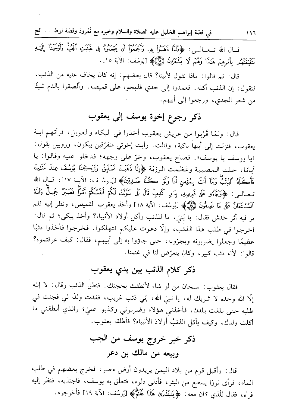 فقال يعقوب : سبحان من لو شاء لأنطقك بحجتك ، فنطق الذئب وقال : لا إله إلا الله وحده لا شريك له ، يا نبي الله ، إني ذئب غريب ، فقدت ولداً لي فجئت في طلبه حتى بلغت بلدك ، فأخذني هؤلاء وضربوني وكذبوا علي ؛ والذي لأنطقني ما أكلت ولدك ، وكيف يأكل الذئب أولاد الأنبياء ؟ فأطلقه يعقوب .