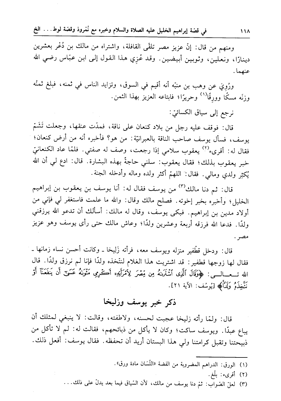 قال : ولما رأته زليخا عجبت لحسنه ، ولاطفته ، وقالت : لا ينبغي لمثلك أن يباع عبداً . ويوسف ساكت ؛ وكان لا يأكل من ذبائحهم ، فقالت له : لم لا تأكل من ذبيحتنا وتقبل كرامتنا ولي هذا البستان أريد أن تحفظه ، فقال يوسف : أفعل ذلك .