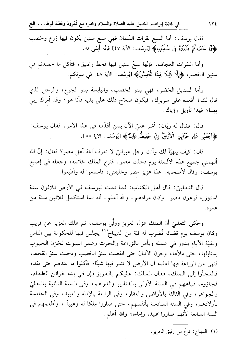 وأما السنابل الخضر ، فهي سنو الخصب ، واليابسة سنو الجوع ، والرجل الذي قال لك أقعده على سريرك ، فيكون صلاح ذلك على يديه فأنا هو ؛ وقد أمرك ربي بهذا ؛ فهذا تأويل رؤياك .