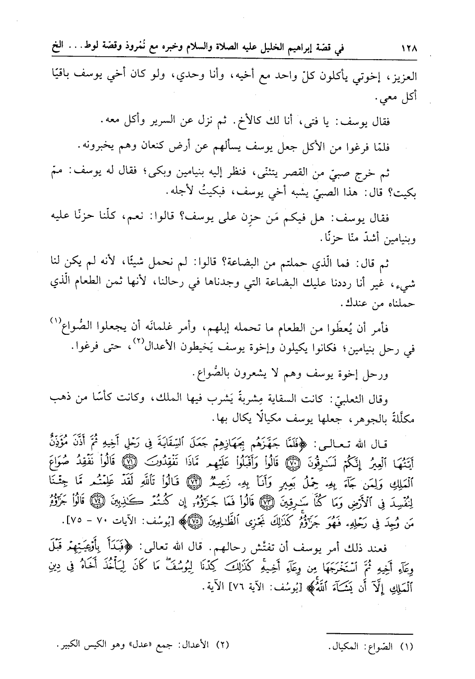 فأمر أن يعطوا من الطعام ما تحمله إبلهم ، وأمر غلمانه أن يجعلوا الصواع في رحل بنيامين ؛ فكانوا يكيلون وإخوة يوسف يخيطون الأعدال ، حتى فرغوا .