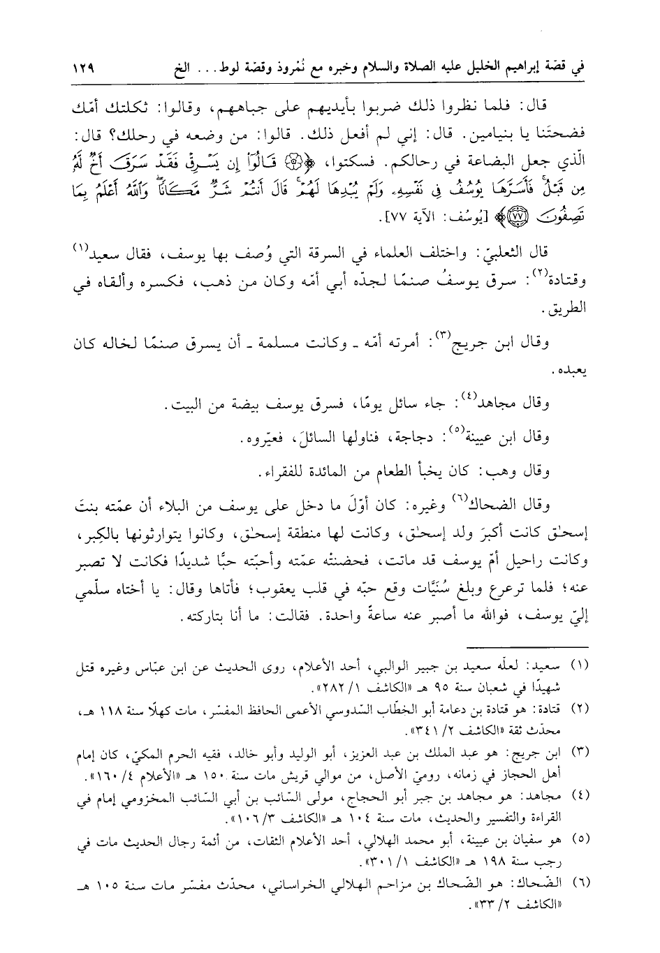 قال الثعلبي : واختلف العلماء في السرقة التي وصف بها يوسف ، فقال سعيد وقتادة : سرق يوسف صنماً لجده أبي أمه وكان من ذهب ، فكسره وألقاه في الطريق .