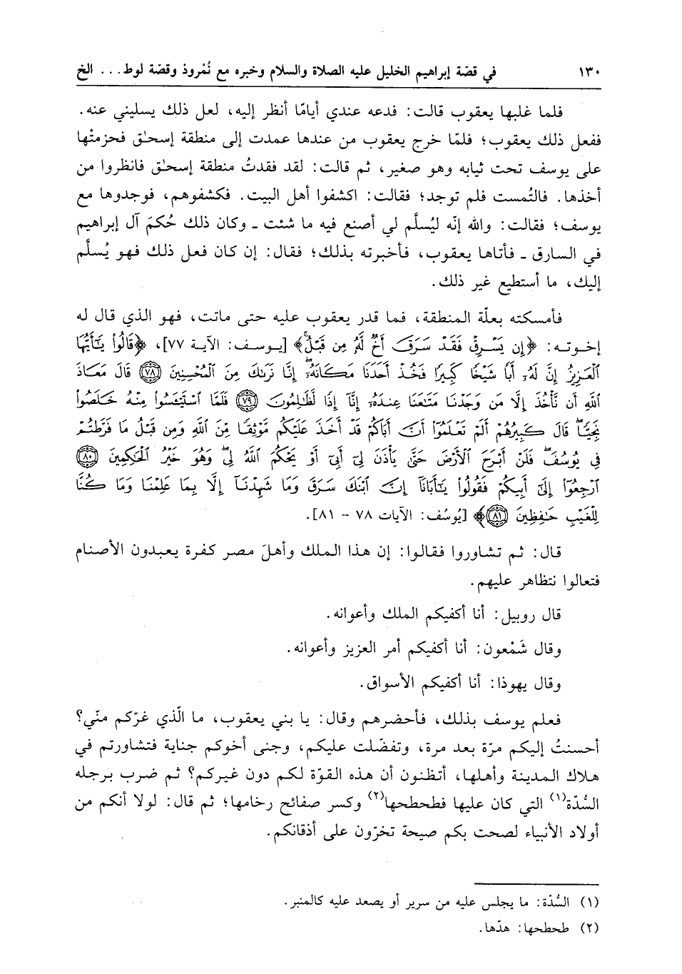 فأمسكته بعلة المنطقة ، فما قدر يعقوب عليه حتى ماتت ، فهو الذي قال له إخوته : إن يسرق فقد سرق أخ له من قبل . قالوا يا أيها العزيز إن له أباً شيخاً كبيراً فخذ أحدنا مكانه إنا نراك من المحسنين ، قال معاذ الله أن نأخذ إلا من وجدنا متاعنا عنده إنا إذاً لظالمون ، فلما استيئسوا منه خلصوا نجياً أي يتناجون قال كبيرهم ألم تعلموا أن أباكم قد أخذ عليكم موثقاً من الله ومن قبل ما فرطتم في يوسف فلن أبرح الأرض حتى يأذن لي أبي أو يحكم الله لي وهو خير الحاكمين ، ارجعوا إلى أبيكم فقولوا يا أبانا إن ابنك سرق وما شهدنا إلا بما علمنا وما كنا للغيب حافظين .