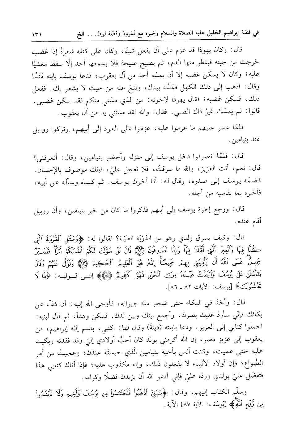 قال : وكان يهوذا قد عزم على أن يفعل شيئاً ، وكان على كتفه شعرة إذا غضب خرجت من جبته فيقطر منها الدم ، ثم يصيح صيحة فلا يسمعها أحد إلا سقط مغشياً عليه ؛ وكان لا يسكن غضبه إلا أن يمسه أحد من آل يعقوب ؛ فدعا يوسف بابنه منسا وقال : اذهب إلى ذلك الكهل فمسه بيدك ، وتنح عنه من حيث لا يشعر بك . ففعل ذلك ، فسكن غضبه ؛ فقال يهوذا لإخوته : من الذي مسني منكم فقد سكن غضبي . قالوا : لم يمسك غير ذلك الصبي . فقال : والله لقد مستني يد من آل يعقوب . فلما عسر عليهم ما عزموا عليه ، عزموا على العود إلى أبيهم ، وتركوا روبيل عند بنيامين .