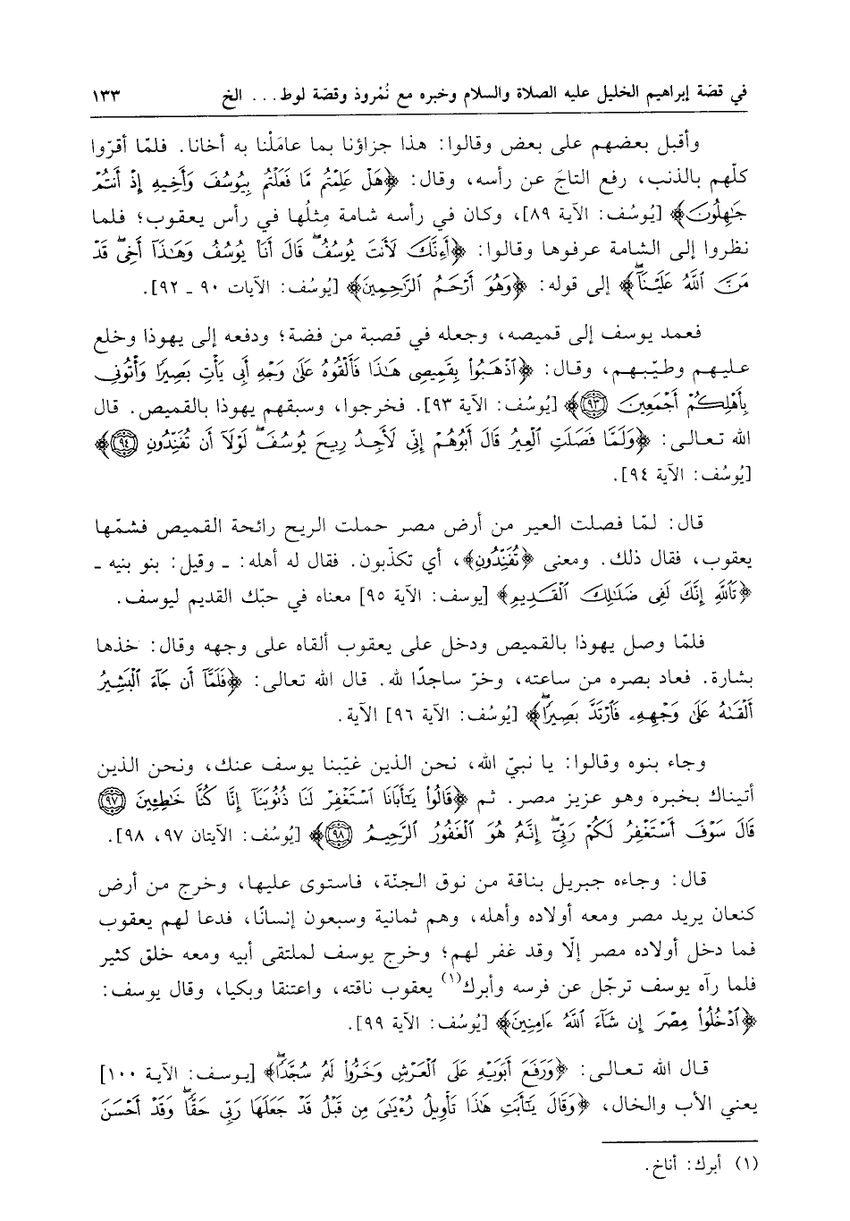 فعمد يوسف إلى قميصه ، وجعله في قصبة من فضة ؛ ودفعه إلى يهوذا وخلع عليهم وطيبهم ، وقال : اذهبوا بقميصي هذا فألقوه على وجه أبي يأت بصيراً وائتوني بأهليكم أجمعين . فخرجوا ، وسبقهم يهوذا بالقميص . قال الله تعالى : " ولما فصلت العير قال أبوهم إني لأجد ريح يوسف لولا أن تفندون " . قال : لما فصلت العير من أرض مصر حملت الريح رائحة القميص فشمها يعقوب ، فقال ذلك . ومعنى تفندون أي تكذبون . فقال له أهله : - وقيل بنو بنيه - تالله إنك لفي ضلالك القديم ، معناه في حبك القديم ليوسف .
