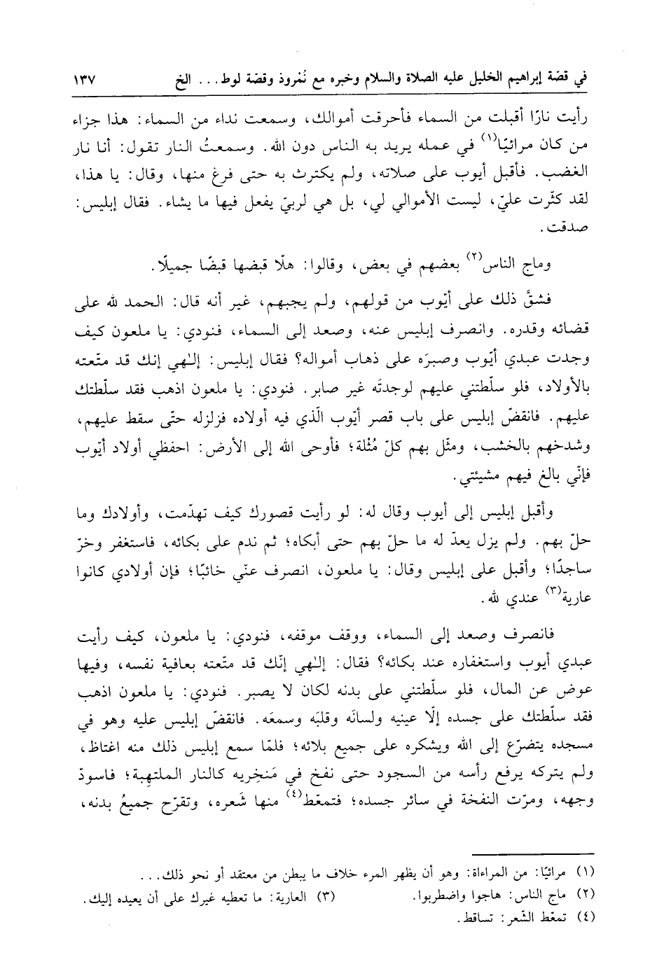 وسمعت النار تقول : أنا نار الغضب . فأقبل أيوب على صلاته ، ولم يكترث به حتى فرغ منها ، وقال : يا هذا ، لقد كثرت علي ، ليست الأموال لي ، بل هي لربي يفعل فيها ما يشاء . فقال إبليس : صدقت .
