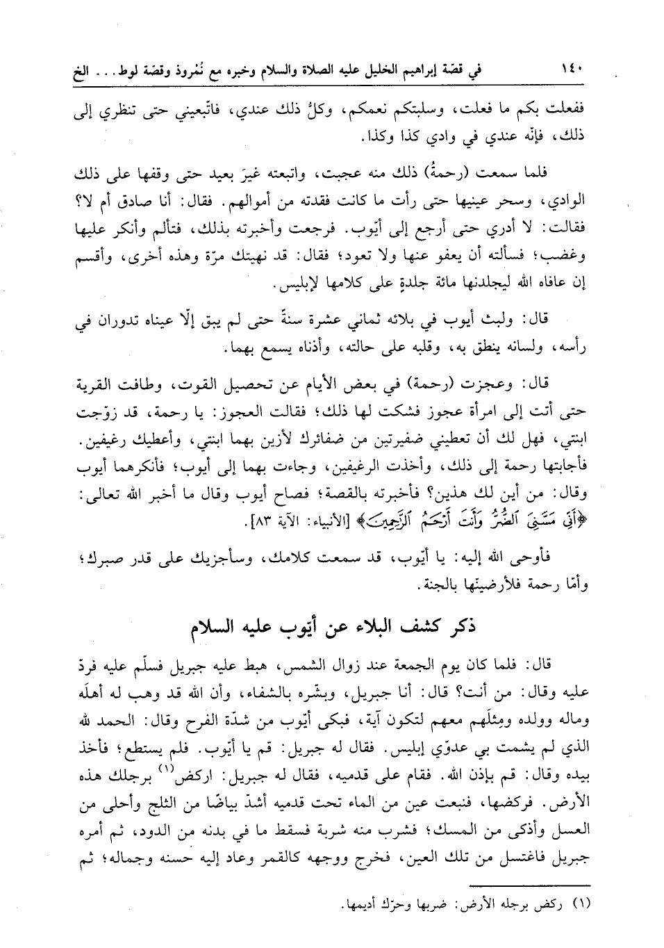 قال : فلما كان يوم الجمعة عند زوال الشمس ، هبط عليه جبريل فسلم عليه فرد عليه وقال : من أنت ؟ قال : أنا جبريل ؛ وبشره بالشفاء ، وأن الله قد وهب له أهله وماله وولده ومثلهم معهم لتكون آية ، فبكى أيوب من شدة الفرح وقال : الحمد لله الذي لم يشمت بي عدوي إبليس . فقال له جبريل : قم يا أيوب . فلم يستطع ؛ فأخذ بيده وقال : قم بإذن الله . فقام على قدميه ، فقال له جبريل : أركض برجلك هذه الأرض . فركضها ، فنبعت عين من الماء تحت قدميه أشد بياضاً من الثلج وأحلى من العسل وأذكى من المسك ؛ فشرب منه شربة فسقط ما في بدنه من الدود ، ثم أمره جبريل فاغتسل من تلك العين ، فخرج وجهه كالقمر وعاد إليه حسنه وجماله ؛ ثم