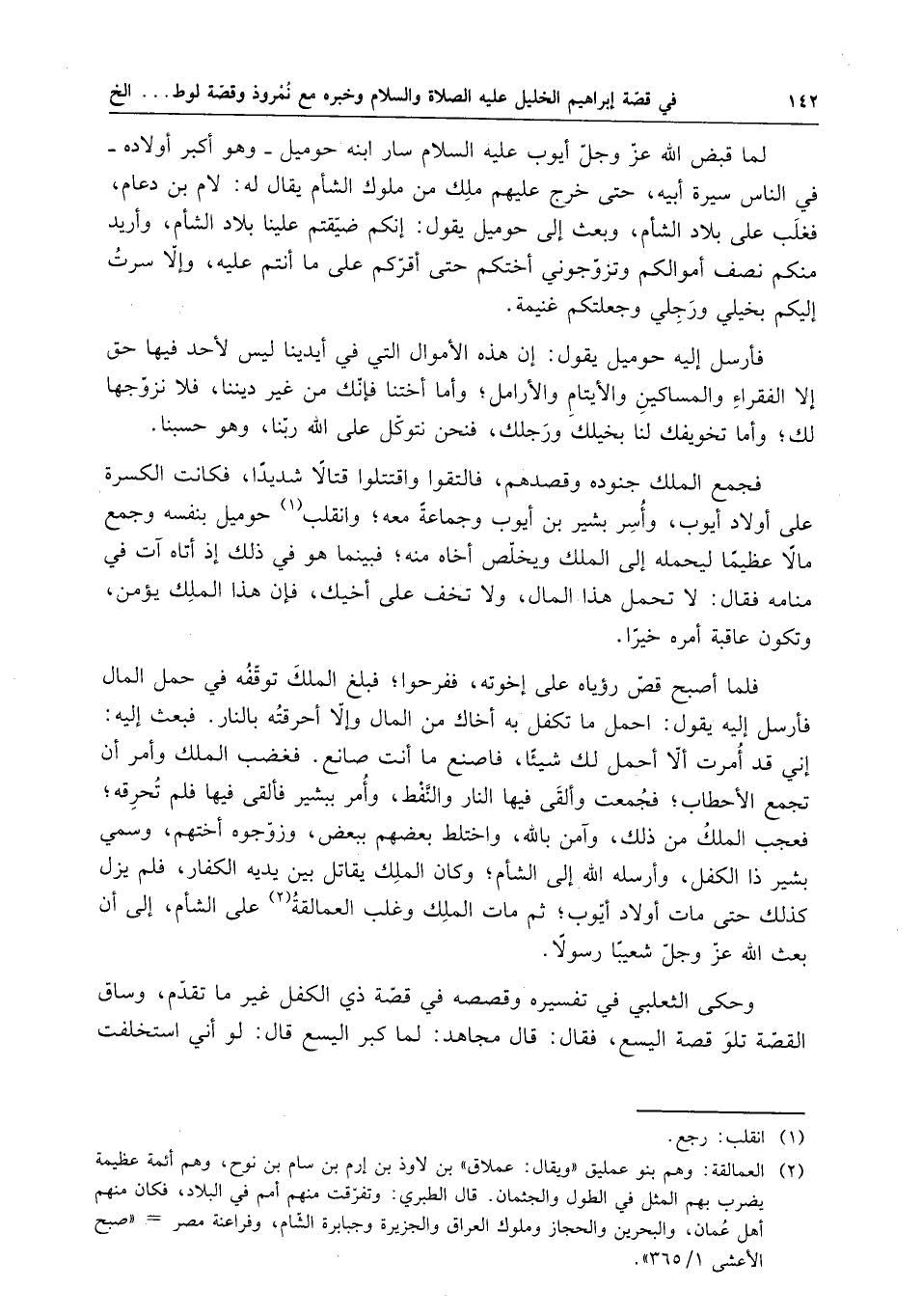 فلما أصبح قص رؤياه على إخوته ، ففرحوا ؛ فبلغ الملك توقفه في حمل المال فأرسل إليه يقول : احمل ما تكفل به أخاك من المال وإلا أحرقته بالنار . فبعث إليه : إني قد أمرت ألا أحمل إليك شيئاً ، فاصنع ما أنت صانع ، فغضب الملك وأمر أن تجمع الأحطاب ؛ فجمعت وألقى فيها النار والنفط ، وأمر ببشير فألقي فيها فلم تحرقه ؛ فعجب الملك من ذلك ، وآمن بالله ، واختلط بعضهم ببعض ، وزوجوه أختهم ، وسمي بشير ذا الكفل ، وأرسله الله إلى الشام ؛ وكان الملك يقاتل بين يديه الكفار ، فلم يزل كذلك حتى مات أولاد أيوب ؛ ثم مات الملك وغلب العمالقة على الشام ، إلى أن بعث الله - عز وجل - شعيباً رسولاً .