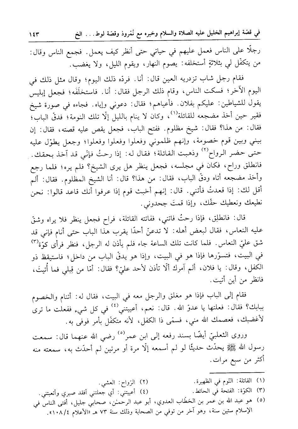 فقام رجل شاب تزدريه العين قال : أنا . فرده ذلك اليوم ؛ وقال مثل ذلك في اليوم الآخر ؛ فسكت الناس ، وقام ذلك الرجل فقال : أنا . فاستخلفه ؛ فجعل إبليس يقول للشياطين : عليكم بفلان . فأعياهم ؛ فقال : دعوني وإياه . فجاءه في صورة شيخ فقير حين أخذ مضجعه للقائلة ، وكان لا ينام بالليل إلا تلك النومة ؛ فدق الباب ؛ فقال : من هذا ؟ فقال : سيخ مظلوم . ففتح الباب ، فجعل يقص عليه قصته ، فقال : إن بيني وبين قوم خصومة ، وإنهم ظلموني وفعلوا وفعلوا وفعلوا ؛ وجعل يطول عليه حتى حضر الرواح وذهبت القائلة ؛ فقال له : إذا رحت فإني قد آخذ بحقك . فانطلق وراح ، فكان في مجلسه ، فجعل ينظر هل يرى الشيخ ؟ فلم يره ؛ فلما رجع وأخذ مضجعه أتاه ودق الباب ، فقال : من هذا ؟ قال : أنا الشيخ المظلوم . فقال : ألم أقل لك : إذا قعدت فأتني . قال : إنهم أخبث قوم إذا عرفوا أنك قاعد قالوا : نحن نطيعك ونعطيك حقك ، وإذا قمت جحدوني .