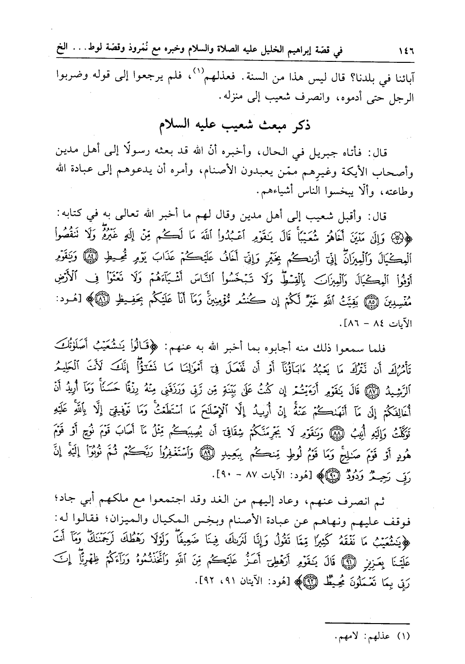 قال : فأتاه جبريل في الحال ، وأخبره أن الله تعالى قد بعثه رسولاً إلى أهل مدين وأصحاب الأيكة وغيرهم ممن يعبدون الأصنام ، وأمره أن يدعوهم إلى عبادة الله وطاعته ، وألا يبخسوا الناس أشيائهم .