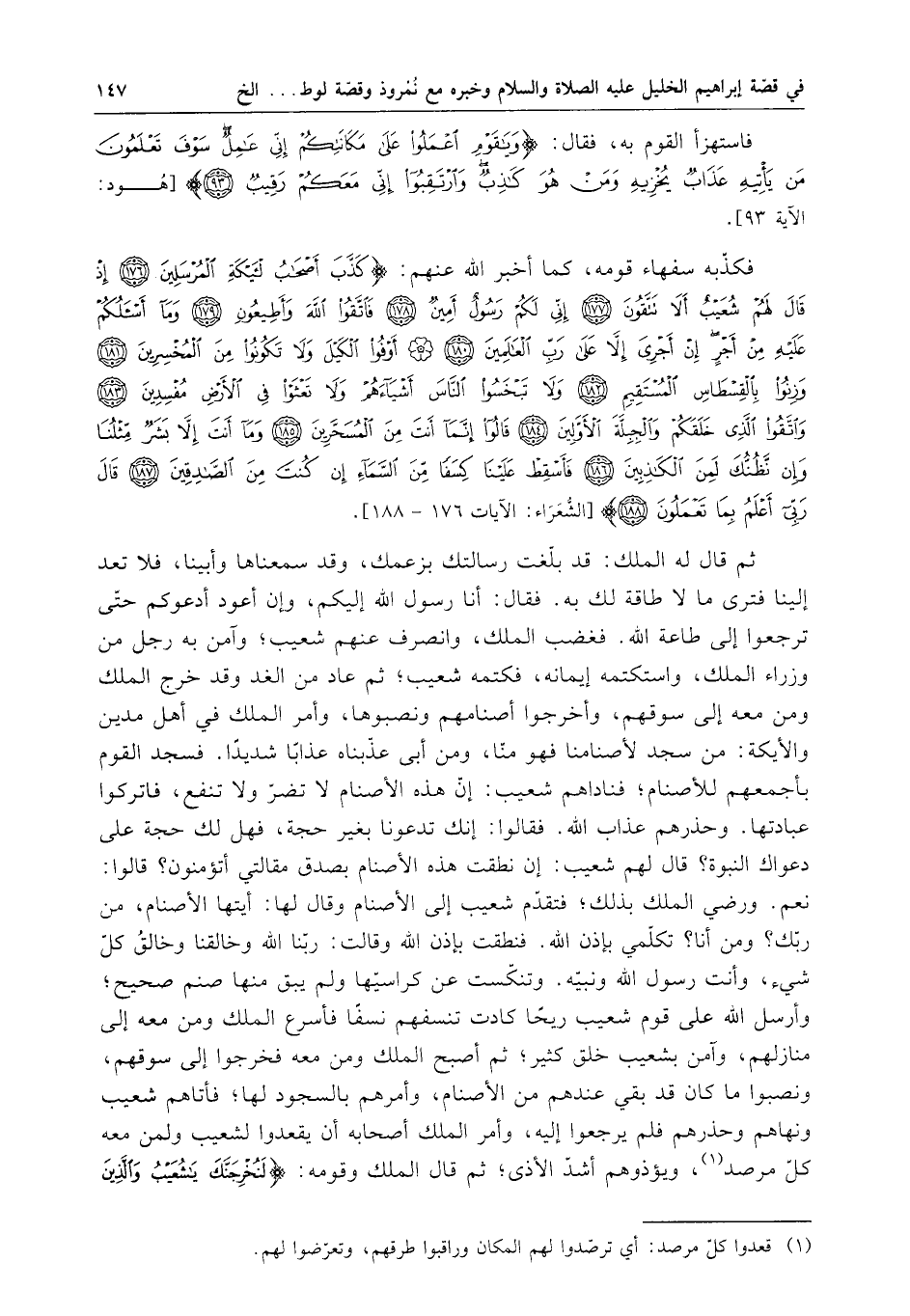 ثم قال له الملك : قد بلغت رسالتك بزعمك ، وقد سمعناها وأبينا ، فلا تعد إلينا فترى ما لا طاقة لك به ، فقال : أنا رسول الله إليكم ، وإني أعود أدعوكم حتى ترجعوا إلى طاعة الله . فغضب الملك ، وانصرف عنهم شعيب ؛ وآمن به رجل من وزراء الملك ، واستكتمه إيمانه ، فكتمه شعيب ؛ ثم عاد من الغد وقد خرج الملك ومن معه إلى سوقهم ، وأخرجوا أصنامهم ونصبوها ؛ وأمر الملك في أهل مدين والأيكة : من سجد لأصنامنا فهو منا ، ومن أبى عذبناه عذاباً شديداً . فسجد القوم بأجمعهم للأصنام ؛ فنا داهم شعيب : إن هذه الأصنام لا تضر ولا تنفع ، فاتركوا عبادتها . وحذرهم عذاب الله . فقالوا : إنك تدعونا بغير حجة ، فهل لك حجة على دعواك النبوة ؟ قال لهم شعيب : إن نطقت هذه الأصنام بصدق مقالتي أتؤمنون ؟ قالوا : نعم . ورضي الملك بذلك ؛ فتقدم شعيب إلى الأصنام وقال لها : أيتها الأصنام ، من ربك ؟ ومن أنا ؟ تكلمي بإذن الله . فنطقت بإذن الله وقالت : ربنا الله وخالقنا وخالق كل شيء ، وأنت رسول الله ونبيه . وتنكست عن كراسيها ولم يبق منها صنم صحيح ؛ وأرسل الله على قوم شعيب ريحاً كادت تنسفهم نسفاً فأسرع الملك ومن معه إلى منازلهم ، وآمن بشعيب خلق كثير ؛ ثم أصبح الملك ومن معه فخرجوا إلى سوقهم ، ونصبوا ما كان قد بقي عندهم من الأصنام ، وأمرهم بالسجود لها ؛ فأتاهم شعيب ونهاهم وحذرهم فلم يرجعوا إليه ، وأمر الملك أصحابه أن يقعدوا لشعيب ولمن معه كل مرصد ، ويؤذوهم أشد الأذى ؛ ثم قال الملك وقومه " لنخرجنك يا شعيب والذين