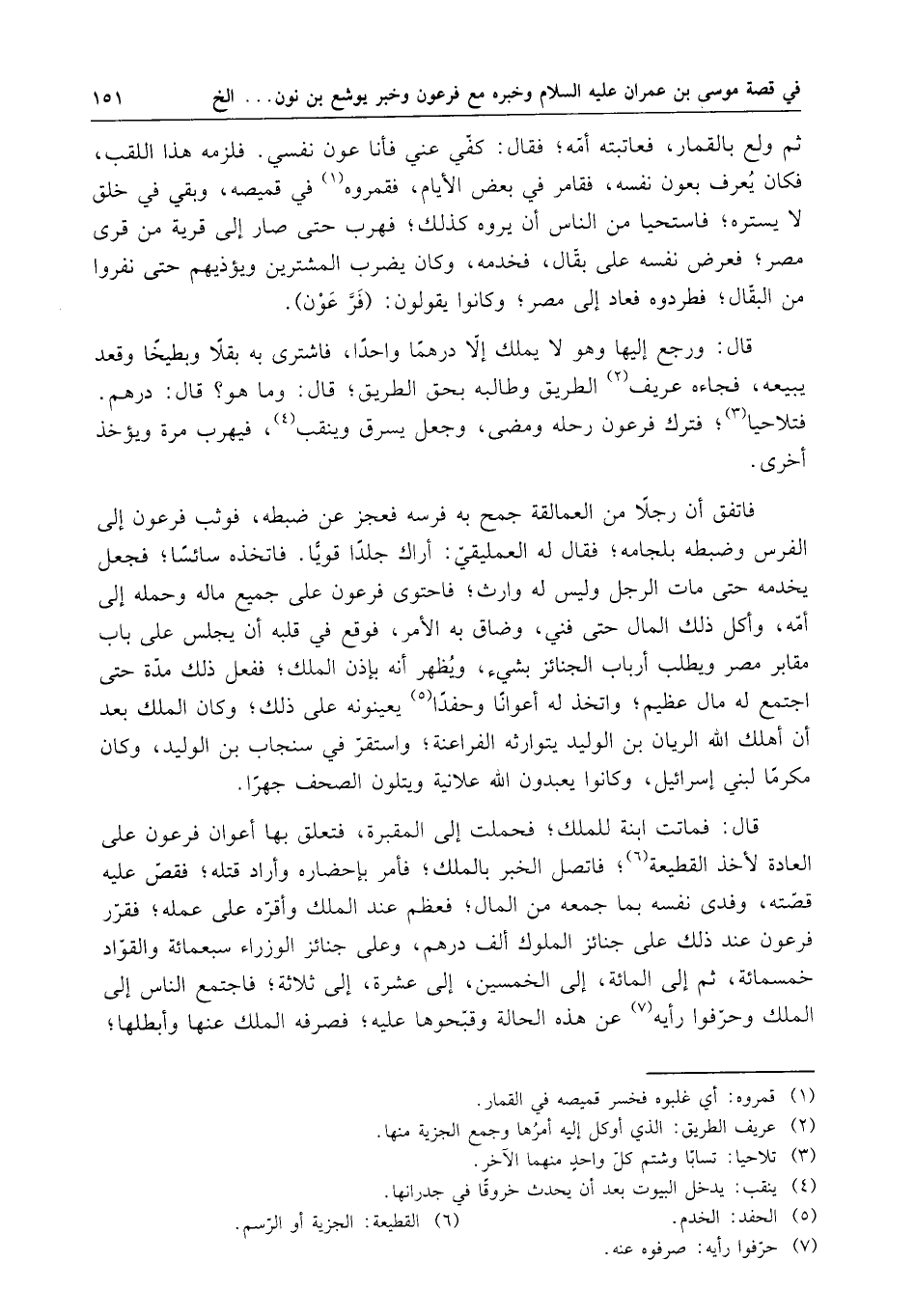 قال : ورجع إليها وهو لا يملك إلا درهماً واحداً ، فاشترى به بقلاً وبطيخاً وقعد يبيعه ، فجاءه عريف الطريق وطالبه بحق الطريق ؛ قال : وما هو ؟ قال : درهم . فتلاحيا ؛ فترك فرعون رحله ومضى ، وجعل يسرق وينقب ، فيهرب مرة ويؤخذ أخرى .