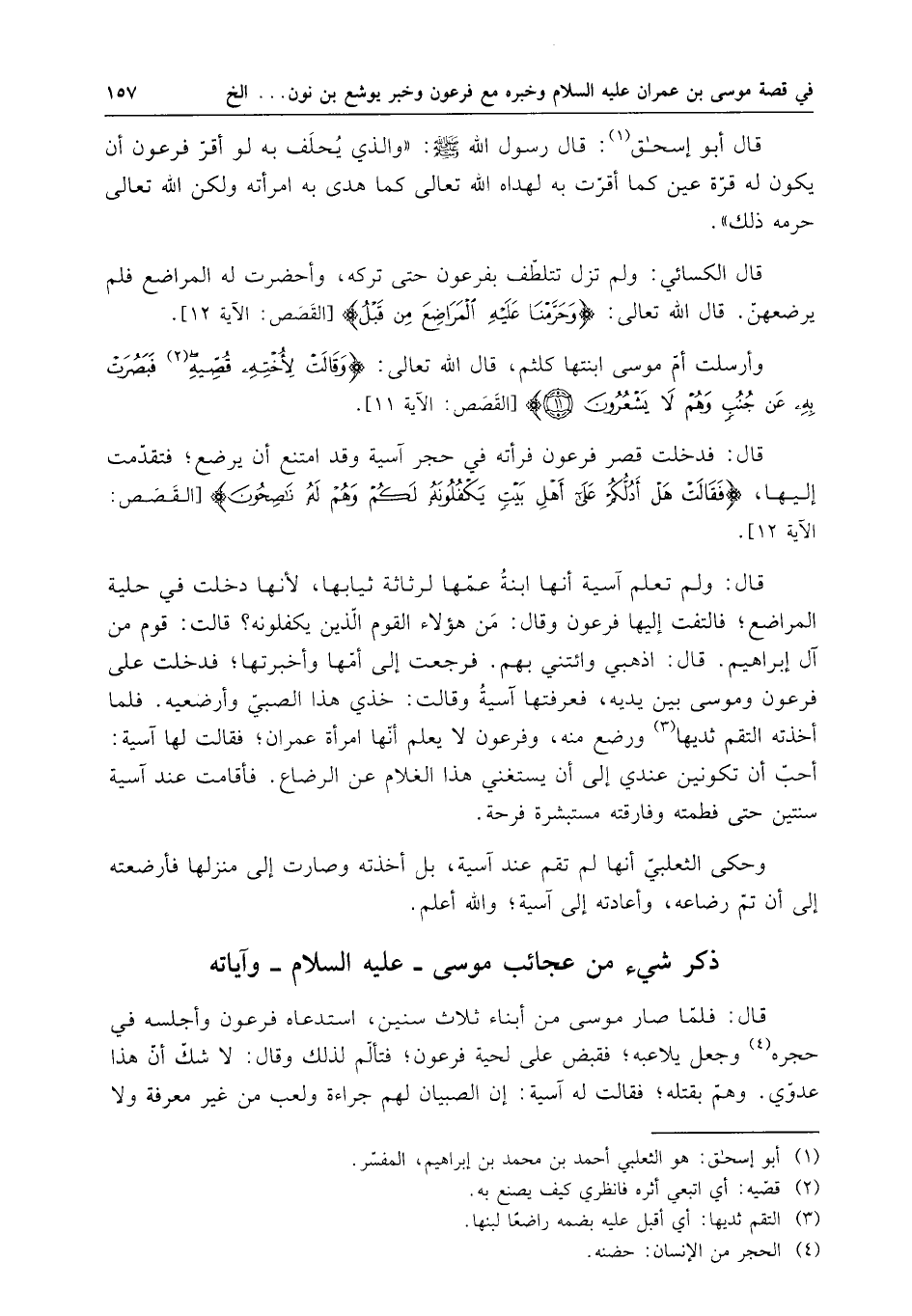 قال : ولم تعلم آسية أنها ابنة عمها لرثاثة ثيابها ، لأنها دخلت في حلبة المراضع ؛ فالتفت إليها فرعون وقال : من هؤلاء القوم الذين يكفلونه ؟ قالت : قوم من آل إبراهيم . قال : اذهبي وائتني بهم . فرجعت إلى أمها وأخبرتها ؛ فدخلت على فرعون وموسى بين يديه ، فعرفتها آسية وقالت : خذي هذا الصبي وأرضعيه . فلما أخذته التقم ثديها ورضع منه ، وفرعون لا يعلم أنها امرأة عمران ؛ فقالت لها آسية : أحب أن تكونين عندي إلى أن يستغني هذا الغلام عن الرضاع . فأقامت عند آسية سنتين حتى فطمته وفارقته مستبشرة فرحة .
