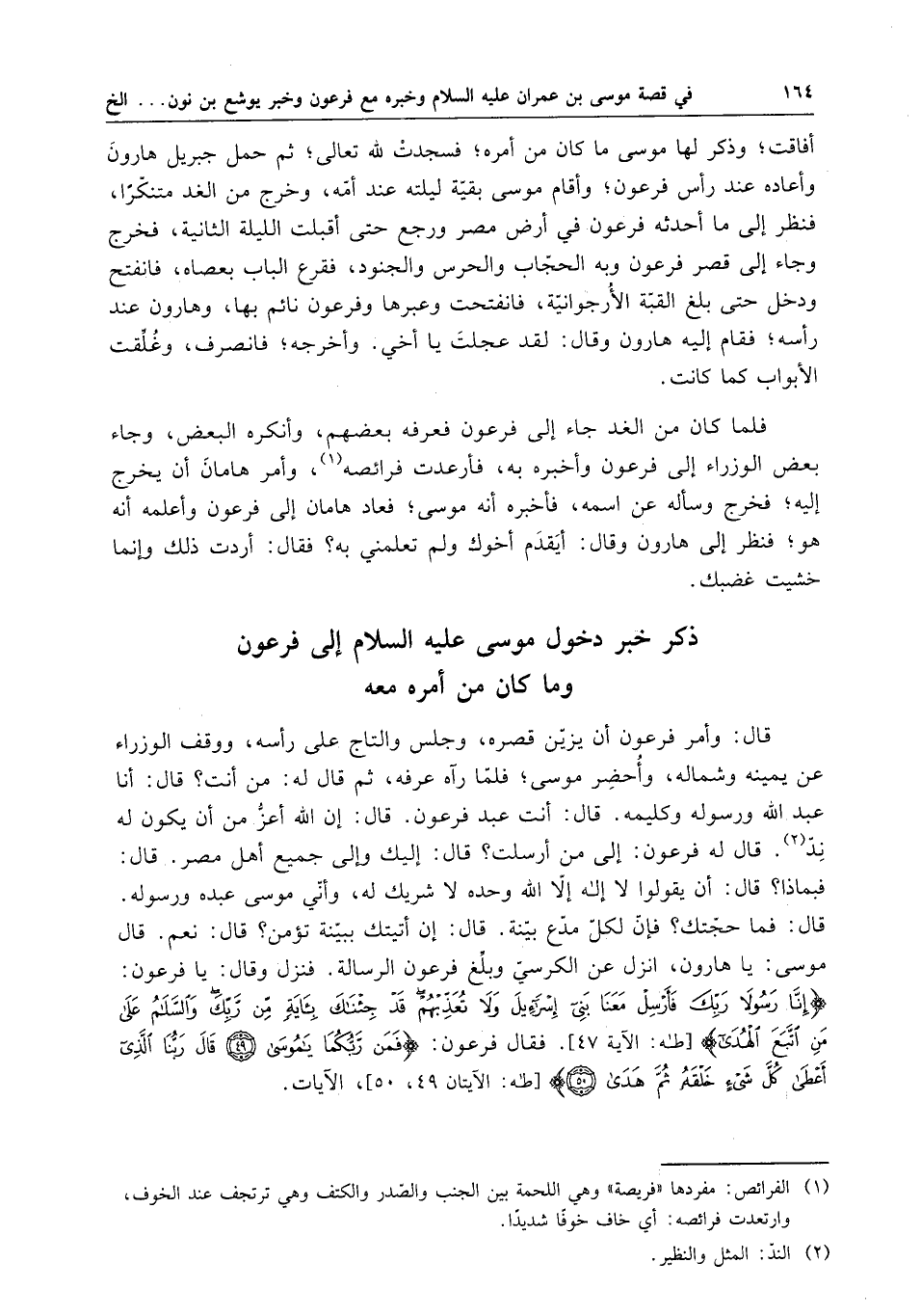 قال : وأمر فرعون أن يزين قصره ، وجلس والتاج على رأسه ، ووقف الوزراء عن يمينه وشماله ، وأحضر موسى ؛ فلما رآه عرفه ، ثم قال له : من أنت ؟ قال : أنا عبد الله ورسوله وكليمه . قال : أنت عبد فرعون . قال : إن الله أعز من أن يكون له ند . قال له فرعون : إلى من أرسلت ؟ قال : إليك وإلى جميع أهل مصر . قال : فبماذا ؟ قال : أن يقولوا لا إله إلا الله وحده لا شريك له ، وأني موسى عبده ورسوله . قال فما حجتك ؟ فإن لكل مدع بينة . قال : إن أتيتك ببينة تؤمن ؟ قال : نعم . قال موسى : يا هارون ، انزل عن الكرسي وبلغ فرعون الرسالة . فنزل وقال : يا فرعون . إنا رسولا ربك فأرسل معنا بني إسرائيل ولا تعذبهم قد جئناك بآية من ربك والسلام على من اتبع الهدى . فقال فرعون : فمن ربكما يا موسى ، قال ربنا الذي أعطى كل شيء خلقه ثم هدى ، الآيات .