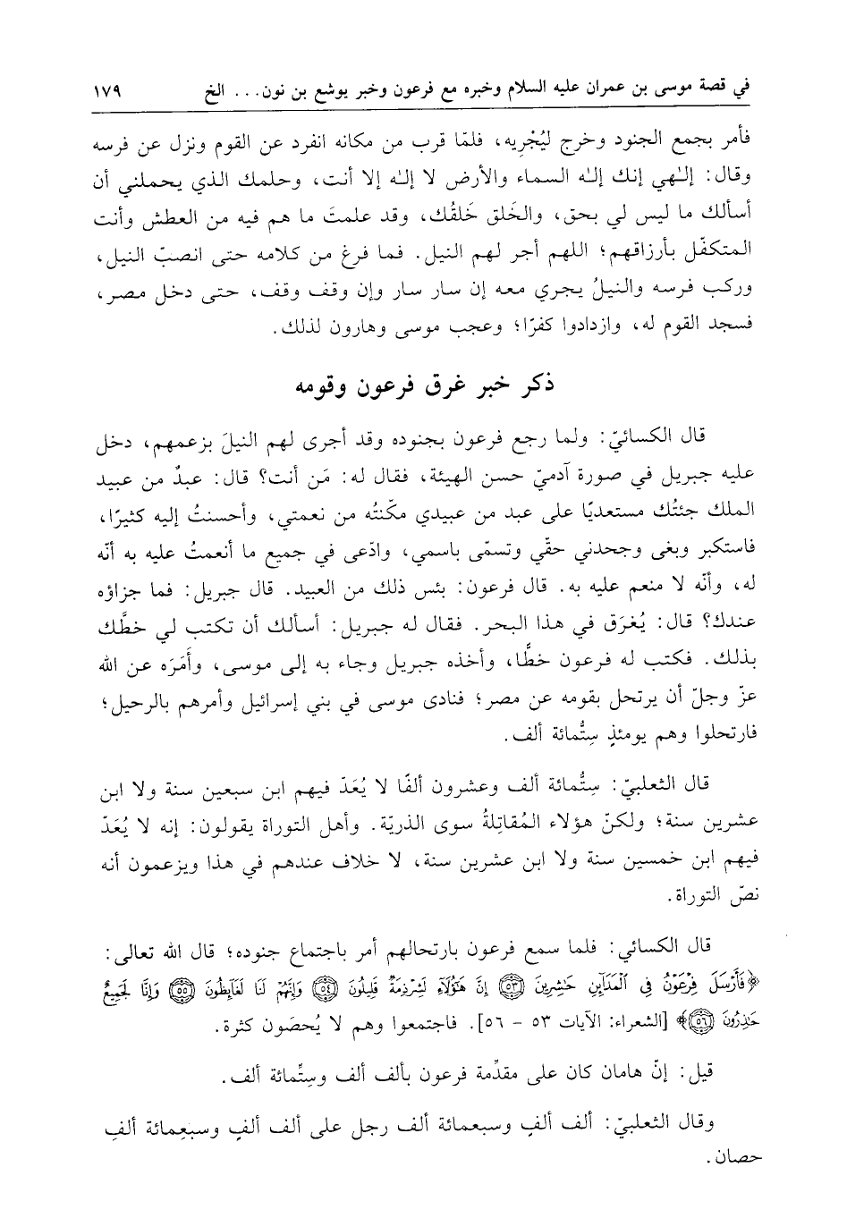 فأمر بجمع الجنود وخرج ليجريه ؛ فلما قرب من مكانه انفرد عن القوم ونزل عن فرسه وقال : إلهي إنك إله السماء والأرض لا إله إلا أنت ، وحلمك الذي يحملني أن أسألك ما ليس لي بحق ، والخلق خلقك ، وقد علمت ما هم فيه من العطش وأنت المتكفل بأرزاقهم ؛ اللهم أجر لهم النيل . فما فرغ من كلامه حتى انصب النيل ، وركب فرسه والنيل يجري معه إن سار سار وأن وقف وقف ، حتى دخل مصر ، فسجد القوم له ، وازدادوا كفراً ؛ وعجب موسى وهارون لذلك .