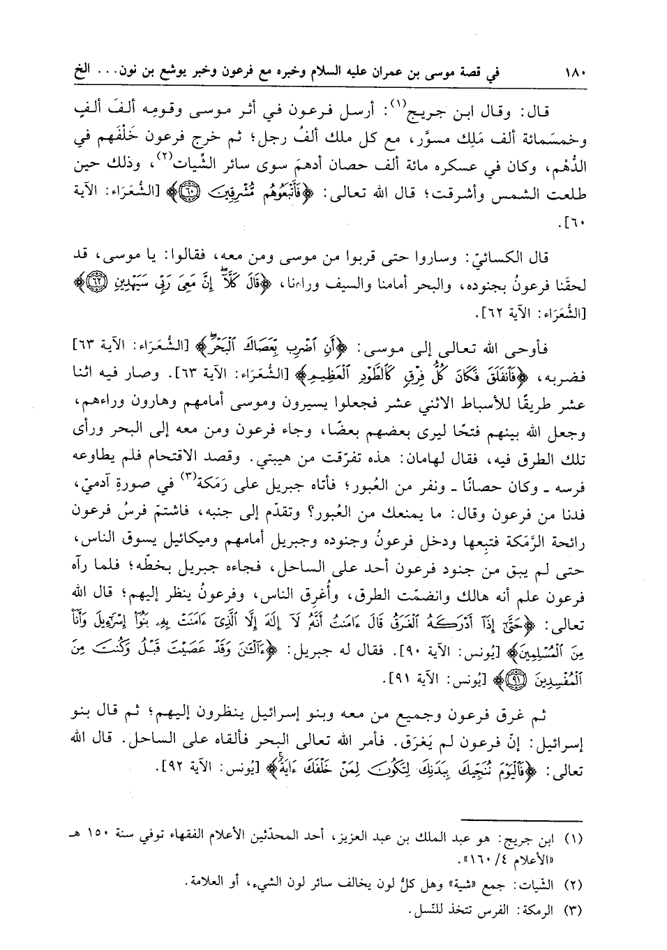 قال : وقال : ابن جريح : أرسل فرعون في أثر موسى وقومه ألف ألف وخمسمائة ألف ملك مسور ، مع كل ملك ألف رجل ؛ ثم خرج فرعون خلفهم في الدهم ، وكان في عسكره مائة ألف حصان أدهم سوى سائر الشيات ، وذلك حين طلعت الشمس وأشرقت ؛ قال الله تعالى : " فأتبعوهم مشرقين " .
