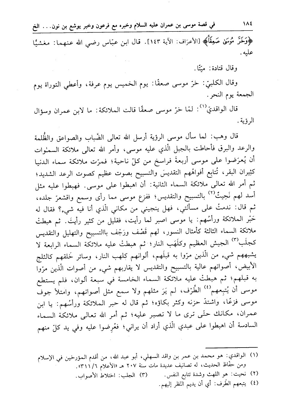 قال وهب : لما سأل موسى الرؤية أرسل الله تعالى الضباب والصواعق والظلمة والرعد والبرق فأحاطت بالجبل الذي عليه موسى ، وأمر الله تعالى ملائكة السموات أن يعرضوا على موسى ، أربعة فراسخ من كل ناحية ، فمرت ملائكة سماء الدنيا كثيران البقر ، تتابع أفواههم التقديس والتسبيح بصوت عظيم كصوت الرعد الشديد ، ثم أمر الله تعالى ملائكة السماء الثانية : أن اهبطوا على موسى . فهبطوا عليه مثل أسد لهم نحيب بالتسبيح والتقديس ، ففزع موسى . مما رأى وسمع واقشعر جلده ، ثم قال : ندمت على مسألتي ، فهل ينجيني من مكاني الذي أنا فيه شىء ؟ فقال له حبر الملائكة ورأسهم : يا موسى اصبر لما رأيت ، فقليل من كثير رأيت . ثم هبطت ملائكة السماء الثالثة كأمثال النسور ، لهم قصف ورجف بالتسبيح والتهليل والتقديس كجلب الجيش العظيم وكلهب النار ، ثم هبطت عليه ملائكة السماء الرابعة لا يشبههم شيء من الذين مروا به قبلهم ، ألوانهم كلهب النار ، وسائر خلقهم كالثلج الأبيض ، أصواتهم عالية بالتسبيح والتقديس لا يقاربهم شيء من أصوات الذين مروا به قبلهم ، ثم هبطت عليه ملائكة السماء الخامسة في سبعة ألوان ، فلم يستطع موسى أن يتبعهم الطرف ، لم ير مثلهم ولا سمع مثل أصواتهم ، وامتلأ جوف موسى فزعاً ، واشتد حزنه وكثر بكاؤه ، ثم قال له حبر الملائكة ورأسهم : يا بن عمران ، مكانك حتى ترى ما لا تصبر عليه ، ثم أمر الله تعالى ملائكة السماء السادسة أن اهبطوا على عبدي الذي أراد أن يراني ، فعرضوا عليه وفي يد كل منهم
