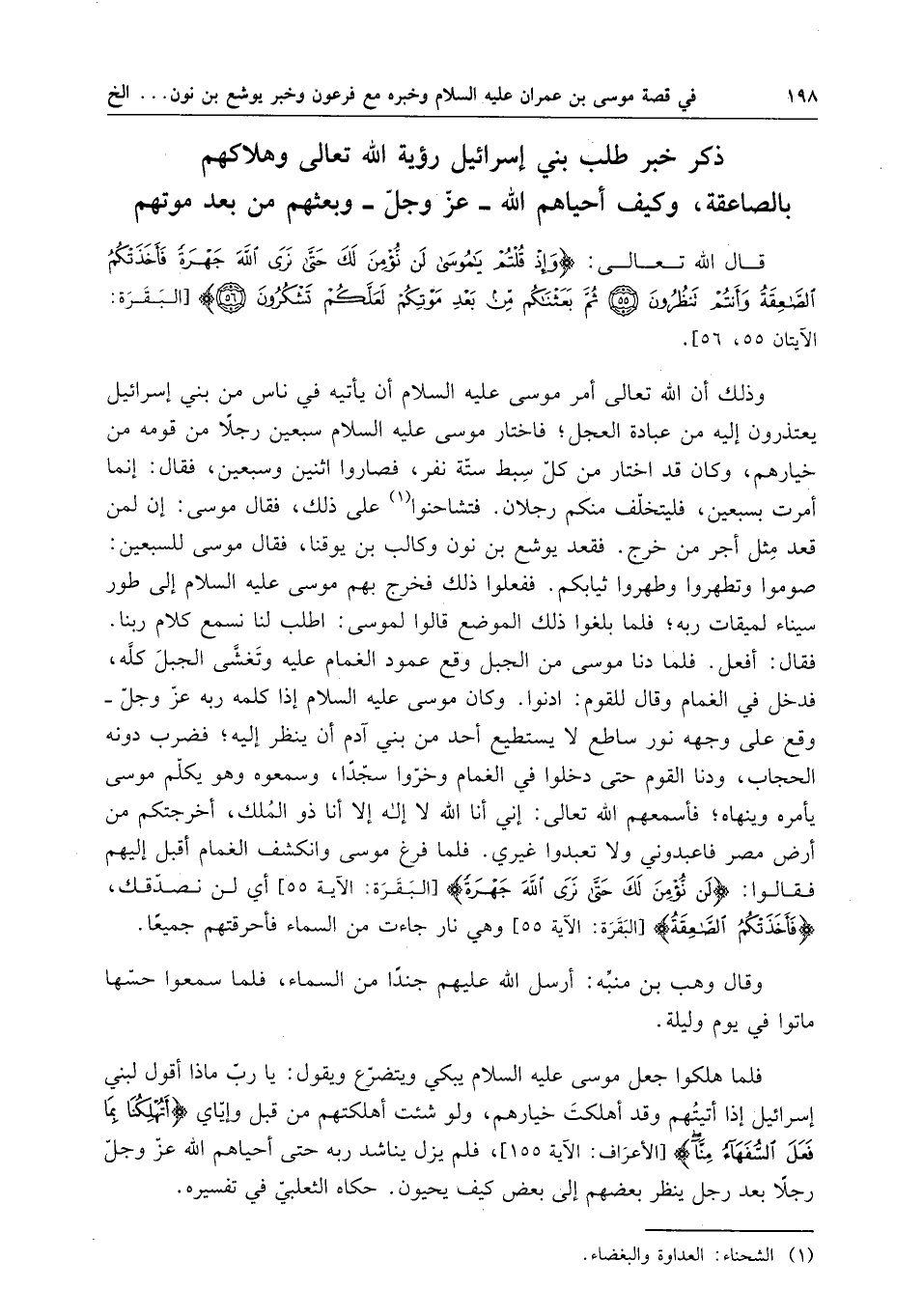 ذكر خبر طلب بني إسرائيل رؤية الله تعالى وهلاكهم بالصاعقة وكيف أحياهم الله - عز وجل - وبعثهم من بعد موتهم