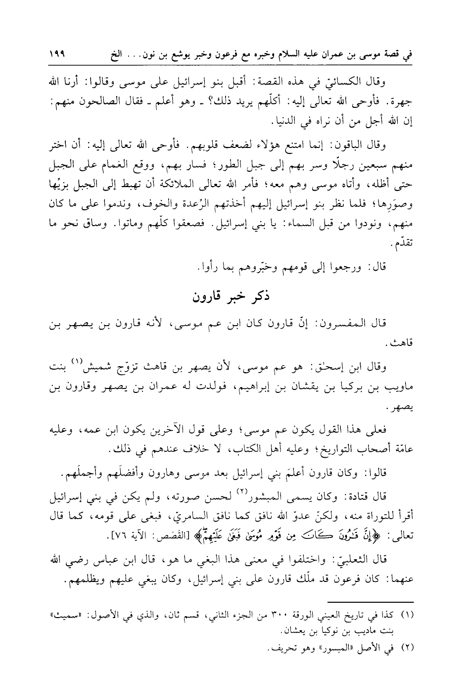 وقال ابن إسحاق : هو عم موسى ، لأن يصهر بن قاهث تزوج شميش بنت ماويب بن بركيا بن يقشان بن إبراهيم ، فولدت له عمران بن يصهر وقارون بن يصهر . فعلى هذا القول يكون عم موسى ؛ وعلى قول الآخرين يكون ابن عمه ، وعليه عامة أصحاب التواريخ ؛ وعليه أهل الكتاب ، لا خلاف عندهم في ذلك قالوا : وكان قارون أعلم بني إسرائيل بعد موسى وهارون وأفضلهم وأجملهم .