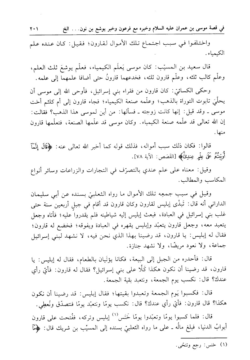 قال سعيد بن المسيب : كان موسى يعلم الكيمياء ، فعلم يوشع ثلث العلم ، وعلم كالب ثلثه ، وعلم قارون ثلثه ؛ فخدعهما قارون حتى أضافا علمهما إلى علمه .