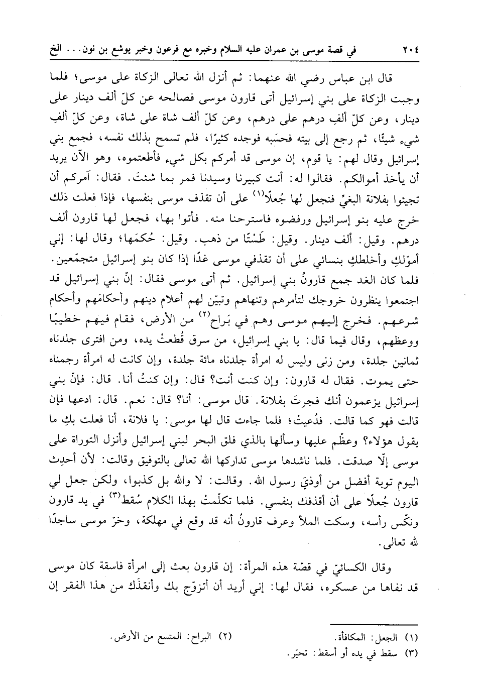 قال ابن عباس - رضي الله عنهما - : ثم أنزل الله تعالى الزكاة على موسى ؛ فلما وجبت الزكاة على بني إسرائيل أتى قارون موسى فصالحه عن كل ألف دينار على دينار ، وعن كل ألف درهم على درهم ، وعن كل ألف شاة على شاة ، وعن كل ألف شيء شيئاً ، ثم رجع إلى بيته فحسبه فوجده كثيراً ، فلم تسمح لذلك نفسه ، فجمع بني إسرائيل وقال لهم : يا قوم ، إن موسى قد أمركم بكل شيء فأطعتموه ، وهو الآن يريد أن يأخذ أموالكم . فقالوا له : أنت كبيرنا وسيدنا فمر بما شئت . فقال : آمركم أن تجيئوا بفلانة البغي فنجعل لها جعلاً على أن تقذف موسى بنفسها ، فإذا فعلت ذلك خرج عليه بنو إسرائيل ورفضوه فاسترحنا منه . فأتوا بها ، فجعل لها قارون ألف درهم . وقيل : ألف دينار . وقيل : طستاً من ذهب . وقيل : حكمها ؛ وقال لها : إني أمولك وأخلطك بنسائي على أن تقذفي موسى غداً إذا كان بنو إسرائيل متجمعين . فلما كان الغد جمع قارون بني إسرائيل ، ثم أتى موسى فقال : إن بني إسرائيل قد اجتمعوا ينظرون خروجك لتأمرهم وتنهاهم وتبين لهم أعلام دينهم وأحكامهم وأحكام شرعهم . فخرج إليهم موسى وهم في براح من الأرض ، فقام فيهم خطيباً ووعظهم ، وقال فيما قال : يا بني إسرائيل ، من سرق قطعت يده ، ومن افترى جلدناه ثمانين جلدة ، ومن زنى وليس له امرأة جلدناه مائة جلدة ، وإن كانت له امرأة رجمناه حتى يموت . فقال له قارون : وإن كنت أنت ؟ قال : وإن كنت أنا . قال : فإن بني إسرائيل يزعمون أنك فجرت بفلانة . قال موسى : أنا ؟ قال : نعم . قال : ادعها فإن قالت فهو كما قالت . فدعيت ؛ فلما جاءت قال لها موسى : يا فلانة ، أنا فعلت بك ما يقول هؤلاء ؟ وعظم عليها وسألها بالذي فلق البحر لبني إسرائيل وأنزل التوراة على موسى إلا صدقت . فلما ناشدها موسى تداركها الله تعالى بالتوفيق وقالت : لأن أحدث اليوم توبة أفضل من أن أوذي رسول الله . وقالت : لا والله بل كذبوا ، ولكن جعل لي قارون جعلاً على أن أقذفك بنفسي . فلما تكلمت بهذا سقط في يد قارون ونكس رأسه ، وسكت الملأ وعرف قارون أن قد وقع في مهلكة ، وخر موسى ساجداً لله تعالى . وقال الكسائي في قصة هذه المرأة : إن قارون بعث إلى امرأة فاسقة كان موسى قد نفاها من عسكره ، فقال لها : إني أريد أن أتزوج بك وأنقذك من هذا الفقر إن