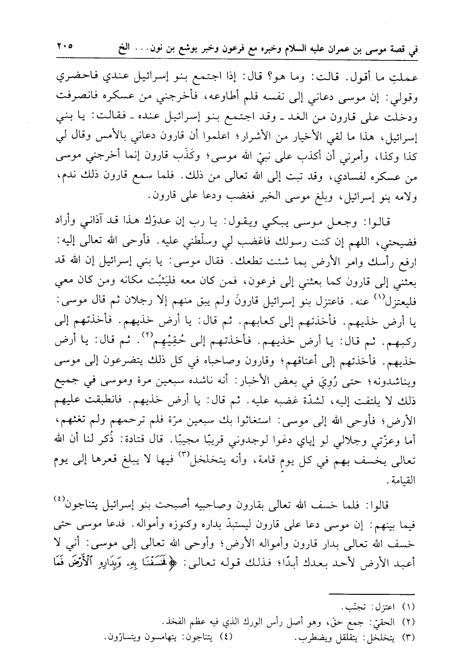 قالوا : وجعل موسى يبكي ويقول : يا رب إن عدوك هذا قد آذاني وأراد فضيحتي ، اللهم إن كنت رسولك فاغضب لي وسلطني عليه . فأوحى الله تعالى إليه : ارفع رأسك وأمر الأرض بما شئت تطعك . فقال موسى : يا بني إسرائيل إن الله قد بعثني إلى قارون كما بعثني إلى فرعون ، فمن كان معه فليثبت مكانه ومن كان معي فليعتزل عنه . فاعتزل بنو إسرائيل قارون ولم يبق منهم إلا رجلان ثم قال موسى : يا أرض خذيهم . فأختهم إلى كعابهم . ثم قال : يا أرض خذيهم . فأخذتهم إلى ركبهم . ثم قال : يا أرض خذيهم . فأخذتهم إلى حقيهم . ثم قال : يا أرض خذيهم . فأخذتهم إلى أعناقهم وقارون وصاحباه في كل ذلك يتضرعون إلى موسى ويناشدونه ؛ حتى روى بعض الأخبار : أنه ناشده سبعين مرة وموسى في جميع ذلك لا يلتفت إليه ، لشدة غضبه عليه . ثم قال : يا أرض خذيهم . فانطبقت عليهم الأرض ؛ فأوحى الله إلى موسى : استغاثوا بك سبعين مرة فلم ترحمهم ولم تغثهم ، أما وعزتي وجلالي لو إياي دعوا لوجدوني قريباً مجيباً .