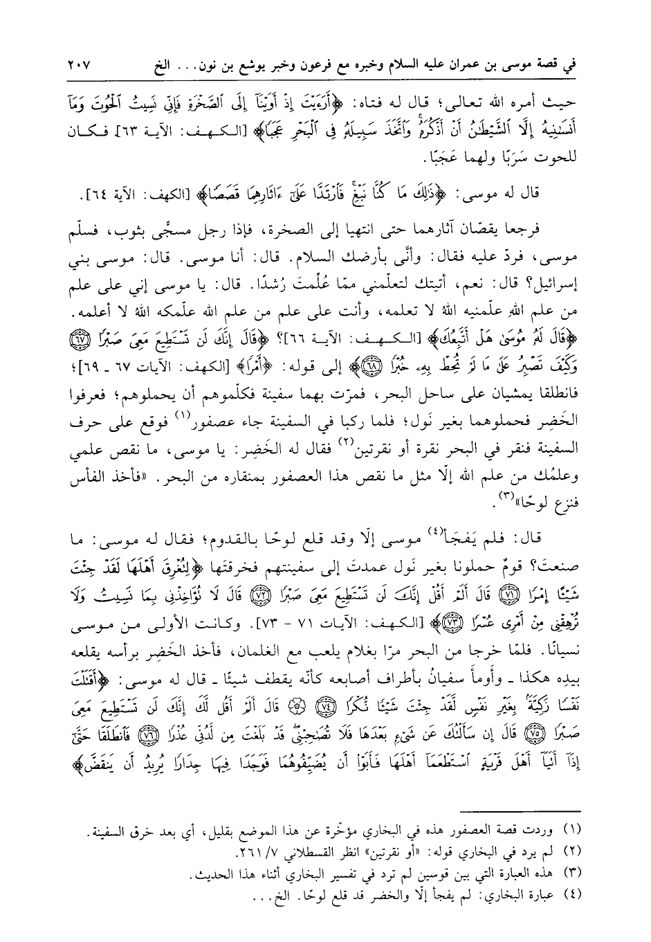 قال : فلم يفجأ موسى إلا وقد قلع لوحاً بالقدوم . فقال له موسى : ما صنعت ؟ قوم حملونا بغير نول عمدت إلى سفينتهم فخرقتها " لتغرق أهلها لقد جئت شيئاً أمراً ، قال ألم أقل لك إنك لن تستطع معي صبراً ، قال لا تؤاخذني بما نسيت ولا ترهقني من أمري عسراً " . وكانت الأولى من موسى نسياناً . فلما خرجا من البحر مرا بغلام يلعب مع الغلمان فأخذ الخضر برأسه يقلعه بيده هكذا - وأومأ سفيان بأطراف أصابعه كأنه يقطف شيئاً - قال له موسى : " أقتلت نفساً زكية بغير نفس لقد جئت شيئاً نكراً ، قال ألم أقل لك إنك لن تستطع معي صبراً ، قال إن سألتك عن شيء بعدها لا تصاحبني قد بلغت من لدني عذراً ، فانطلقا حتى إذا أتيا أهل قرية استطعما أهلها فأبوا أن يضيفوهما فوجدا فيها جداراً يريد أن ينقض "