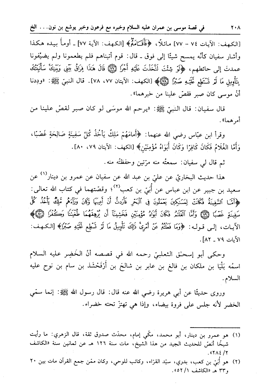 هذا حديث البخاري عن علي ابن عبد الله عن سفيان عن عمرو بن دينار عن سعيد بن جبير عن ابن عباس عن أبي بن كعب ؛ وقصتهما في كتاب الله تعالى : " أما السفينة فكانت لمساكين يعملون في البحر فأرت أن أعيبها وكان وراءهم ملك يأخذ كل سفينة غصباً ، وأما الغلام فكان أبواه مؤمنين فخشينا أن يرهقهما طغياناً وكفراً " الآيات ، إلى قوله : " وما فعلته عن أمري ذلك تأويل ما لم تسطع عليه صبراً " .