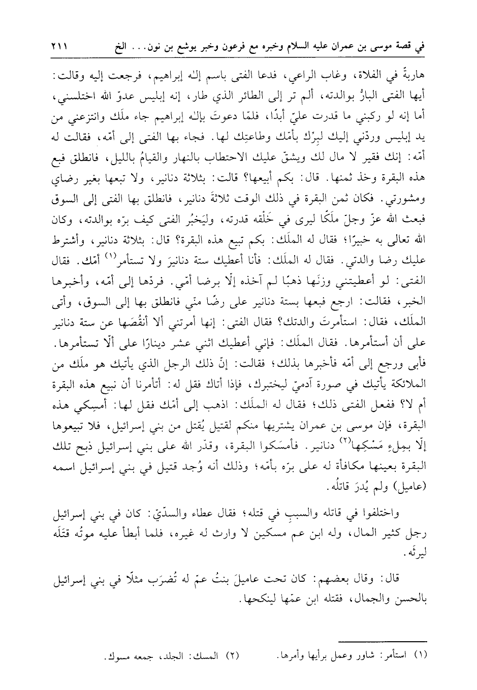 هاربة في الفلاة ، وغاب الراعي ، فدعا الفتى باسم إله إبراهيم ، فرجعت إليه وقالت : أيها الفتى البار بوالدته ، ألم تر إلى الطائر الذي طار ، إنه إبليس عدو الله اختلسني ، أما إنه لو ركبني ما قدرت علي أبداً ، فلما دعوت بإله إبراهيم جاء ملك وانتزعني من يد إبليس وردني إليك لبرك بأمك وطاعتك لها . فجاء بها الفتى إلى أمه ، فقالت له أمه : إنك فقير لا مال لك ويشق عليك الاحتطاب بالنهار والقيام بالليل ، فانطلق فبع هذه البقرة وخذ ثمنها . قال : بكم أبيعها ؟ قالت : بثلاثة دنانير ، ولا تبعها بغير رضاي ومشورتي . فكان ثمن البقرة في ذلك الوقت ثلاثة دنانير ، فانطلق بها الفتى إلى السوق فبعث الله - عز وجل - ملكاً ليرى في خلقه قدرته ، وليخبر الفتى كيف بره بوالدته ، وكان الله تعالى به خبيراً ؛ فقال له الملك : بكم تبيع هذه البقرة ؟ قال : ثلاثة دنانير ، وأشترط عليك رضا والدتي . فقال له الملك : فأنا أعطيك ستة دنانير ولا تستأمر أمك . فقال الفتى : لو أعطيتني وزنها ذهباً لم آخذه إلا برضا أمي . فردها إلى أمه ، وأخبرها الخبر ، ارجع فبعها بستة دنانير على رضا مني فانطلق بها إلى السوق ، وأتى الملك ، فقال : استأمرت والدتك ؟ فقال الفتى : إنها أمرتني ألا أنقصها عن ستة دنانير على أن أستأمرها . فقال الملك : فإني أعطيك اثني عشر ديناراً على ألا تستأمرها . فأبى ورجع إلى أمه فأخبرها بذلك ؛ فقالت : إن ذلك الرجل الذي يأتيك هو ملك من الملائكة يأتيك بصورة آدمي ليختبرك ، فإذا أتاك فقل له : أتأمرنا أن نبيع هذه البقرة أم لا ؟ ففعل الفتى ذلك ؛ فقال له الملك : اذهب إلى أمك فقل لها : أمسكي هذه البقرة ، فإن موسى بن عمران يشتريها منكم لقتيل يقتل من بني إسرائيل ، فلا تبيعوها إلا بملء مسكها دنانير . فأمسكوا البقرة ، وقدر الله على بني إسرائيل ذبح تلك البقرة بعينها مكافأة له على بره بأمه ؛ وذلك أنه وجد قتيل في بني إسرائيل اسمه عاميل ولم يدر قاتله .