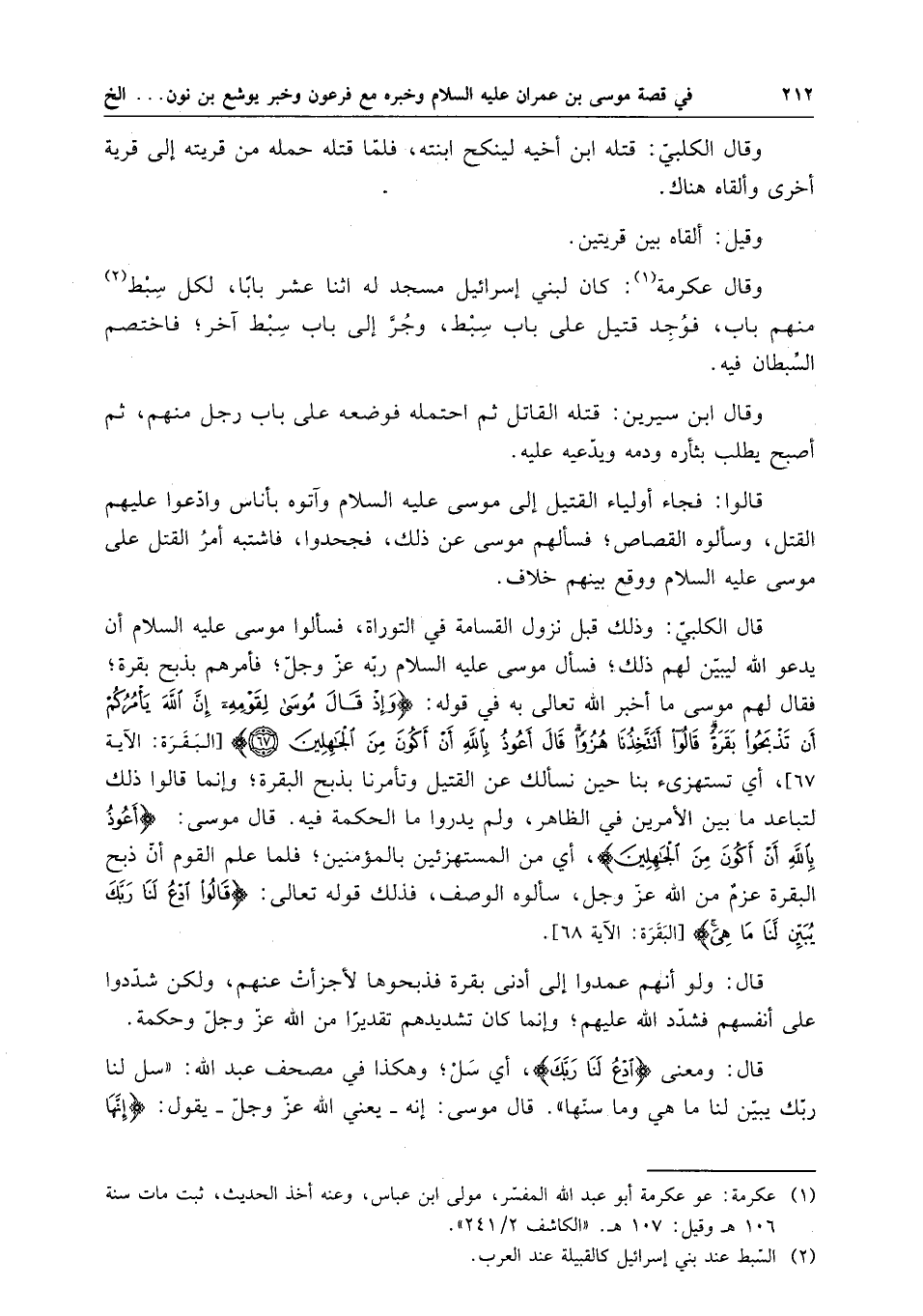 قالوا : فجاء أولياء القتيل إلى موسى - عليه السلام - وأتوه بأناس وادعوا عليهم القتل ، وسألوه القصاص ؛ فسألهم موسى عن ذلك ، فجحدوا ، فاشتبه أمر القتيل على موسى - عليه السلام - ووقع بينهم خلاف .