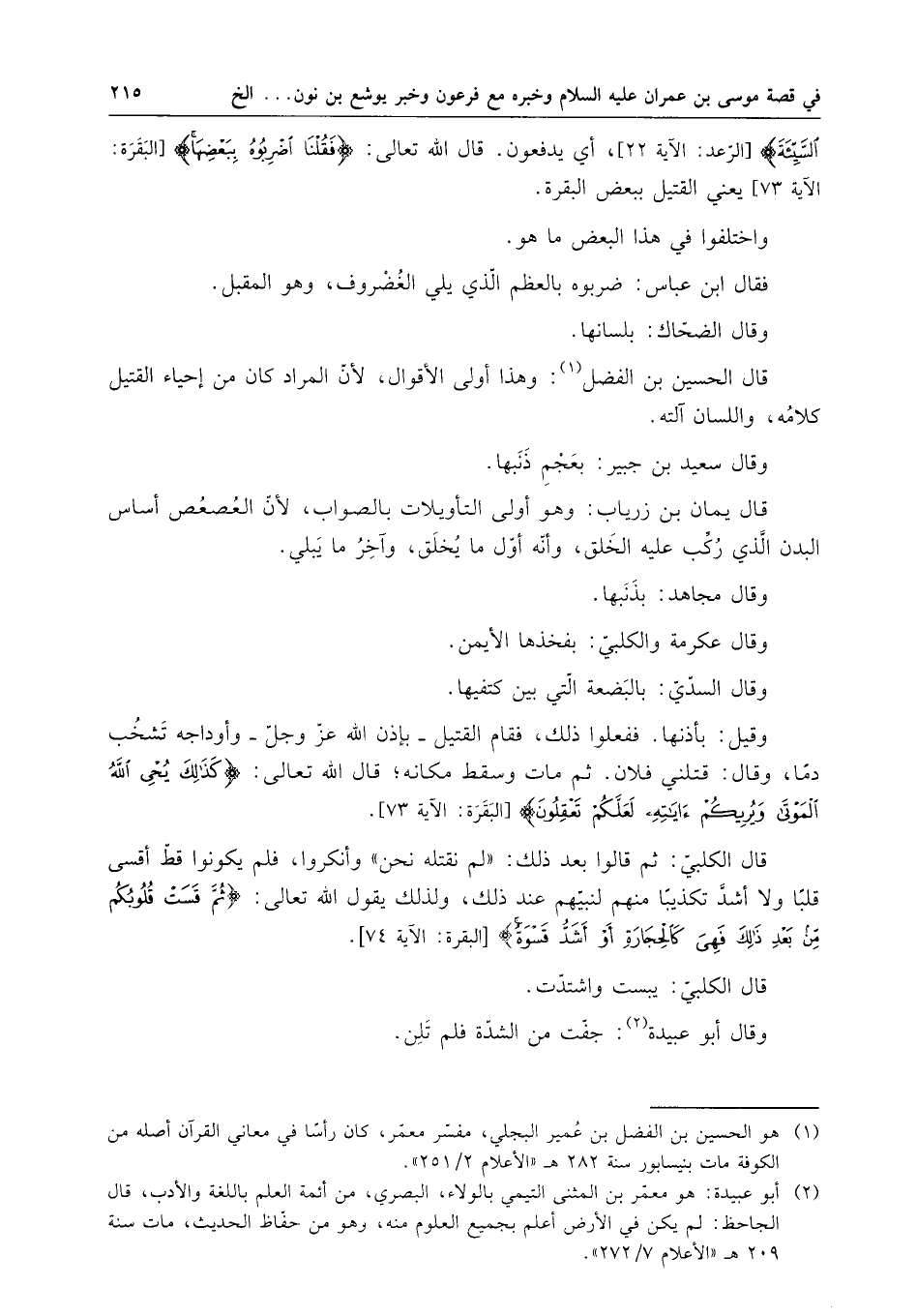 قال الحسين بن الفضل : وهذا أولى الأقوال ، لأن المراد كان من إحياء القتيل كلامه ، واللسان آلته .