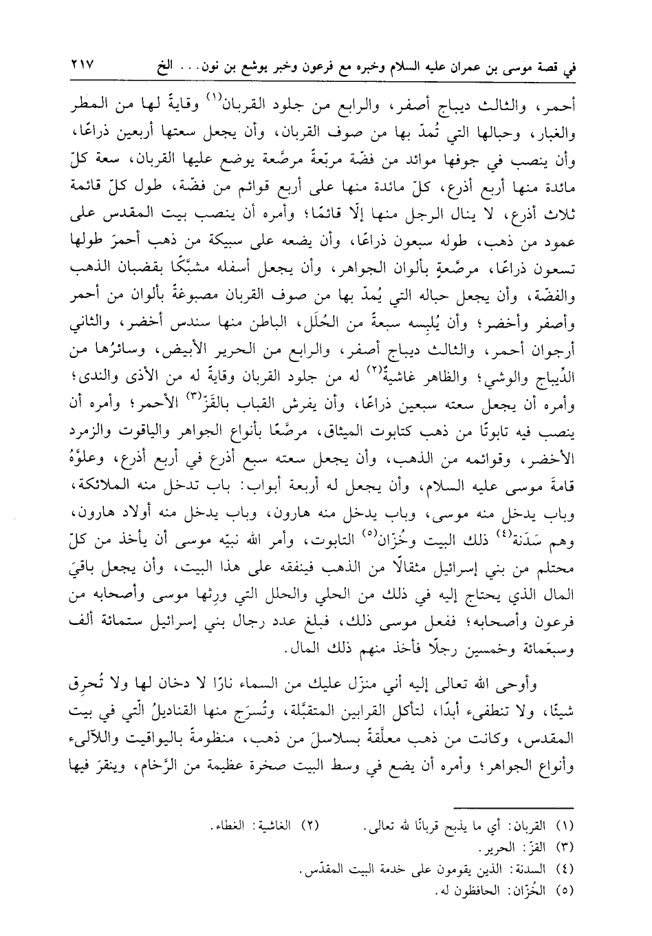 أحمر ، والثالث ديباج أصفر ، والرابع من جلود القربان وقاية لها من المطر والغبار ، وحبالها التي تمد بها من صوف القربان ، وأن يجعل سعتها أربعين ذراعاً ، وأن ينصب في جوفها موائد من فضة مربعة مرصعة يوضع عليها القربان ، سعة كل مائدة منها أربع أذرع ، لا ينال الرجل منها إلا قائماً ؛ وأمر أن ينصب بيت المقدس على عمود من ذهب ، طوله سبعون ذراعاً ، وأن يضعه على سبيكة من ذهب أحمر طولها تسعون ذراعاً ، مرصعة بألوان الجواهر ، وأن يجعل أسفله مشبكاً بقضبان الذهب والفضة ، وأن يجعل حباله التي يمد بها من صوف القربان مصبوغة بألوان من أحمر وأصفر وأخضر ؛ وأن يلبسه سبعة من الحلل ، الباطن منها سندس أخضر ، والثاني أرجوان أحمر ، والثالث ديباج أصفر ، والرابع من الحرير الأبيض ، وسائرها من الديباج والوشي ؛ والظاهر غاشية له من جلود القربان وقاية له من الأذى والندى ؛ وأمره أن يجعل سعته سبعين ذراعاً ، وأن يفرش القباب بالقز الأحمر ؛ وأمره أن ينصب فيه تابوتاً من ذهب كتابوت الميثاق ، مرصعاً بأنواع الجواهر والياقوت والزمرد الأخضر ، وقوائمه من الذهب ، وأن يجعل سعته سبع أذرع في أربع أذرع ، وعلوم قامة موسى عليه السلام ، وأن يجعل له أربعة أبواب : باب تدخل منه الملائكة ، وباب يدخل منه موسى ، وباب يدخل منه هارون ، وباب يدخل منه أولاد هارون ، وهم سدنة ذلك البيت وخزان التابوت ، وأمر الله نبيه موسى أن يأخذ من كل محتلم من بني إسرائيل مثقالاً من الذهب فينفقه على هذا البيت ، وأن يجعل باقي المال الذي يحتاج إليه في ذلك من الحلي والحلل التي ورثها موسى وأصحابه من فرعون وأصحابه ؛ ففعل موسى ذلك ، فبلغ عدد رجال بني إسرائيل ستمائة ألف وسبعمائة وخمسين رجلاً فأخذ منهم ذلك المال .