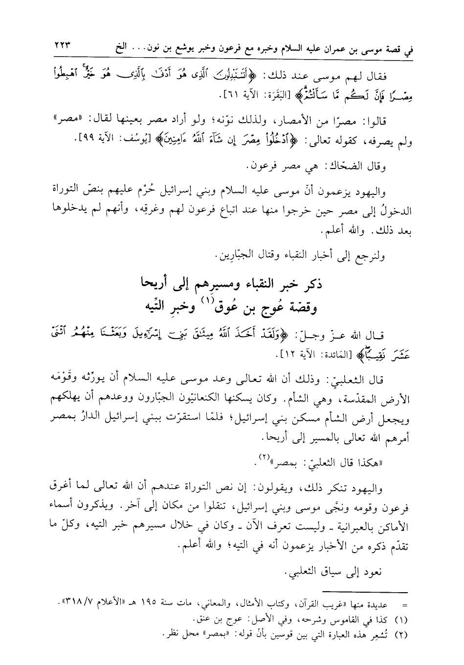 واليهود يزعمون أن موسى - عليه السلام - وبني إسرائيل حرم عليهم بنص التوراة الدخول إلى مصر حين خرجوا منها عند اتباع فرعون لهم وغرقه ، وأنهم لم يدخلوها بعد ذلك . والله أعلم .