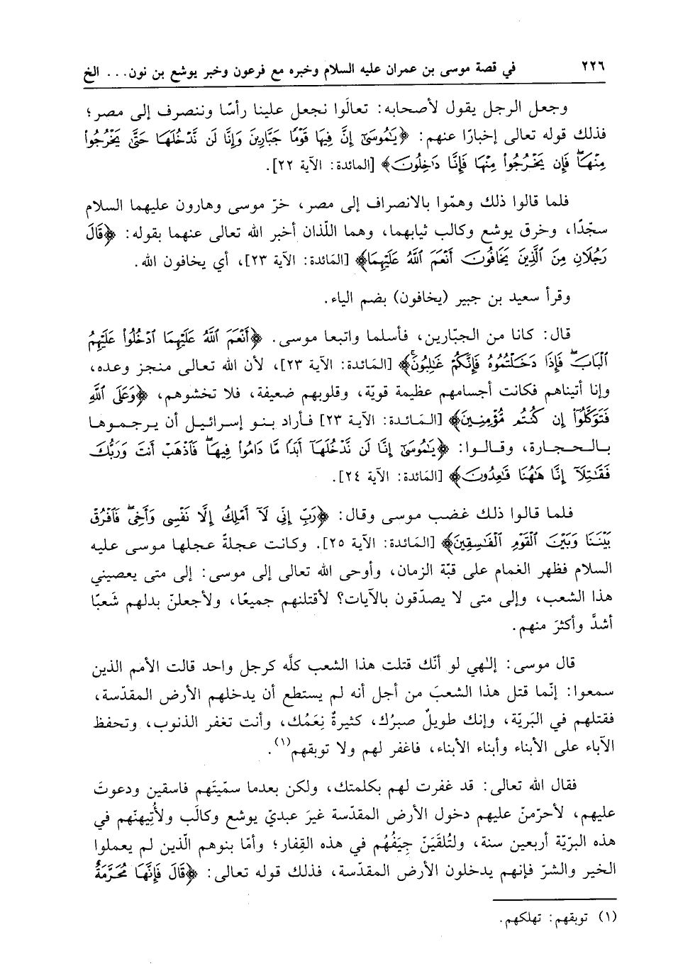 وجعل الرجل يقول لأصحابه : تعالوا نجعل علينا رأساً وننصرف إلى مصر ؛ فذلك قوله تعالى إخباراً عنهم : " يا موسى إن فيها قوماً جبارين وإنا لن ندخلها حتى يخرجوا منها فإن يخرجوا منها فإنا داخلون " . فلما قالوا ذلك وهموا بالانصراف إلى مصر ، خر موسى وهارون - عليهما السلام - سجداً ، وخرق يوشع وكالب ثيابهما ، وهما اللذان أخبر الله تعالى عنهما بقوله : " قال رجلان من اللذين يخافون أنعم الله عليهما " ، أي يخافون الله .