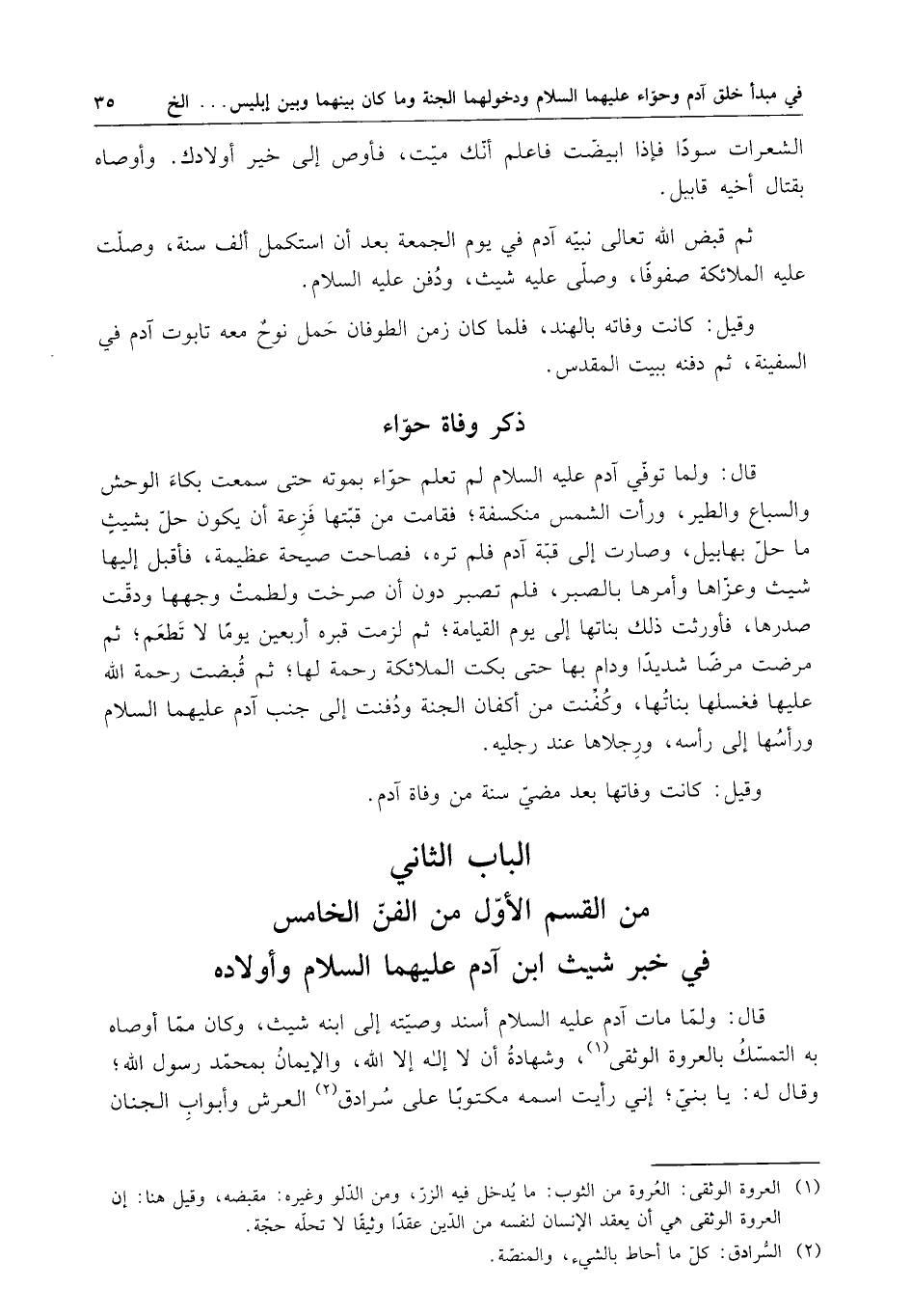 الباب الثاني من القسم الأول من الفن الخامس في خبر شيث ابن آدم عليهما السلام وأولاده